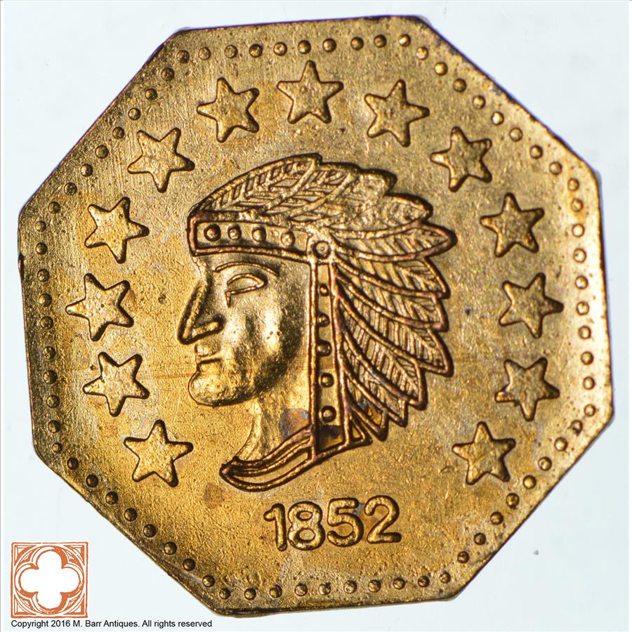Octagonal - Souvenir Tribute Token - 1852 Indian Head - California Gold Rush