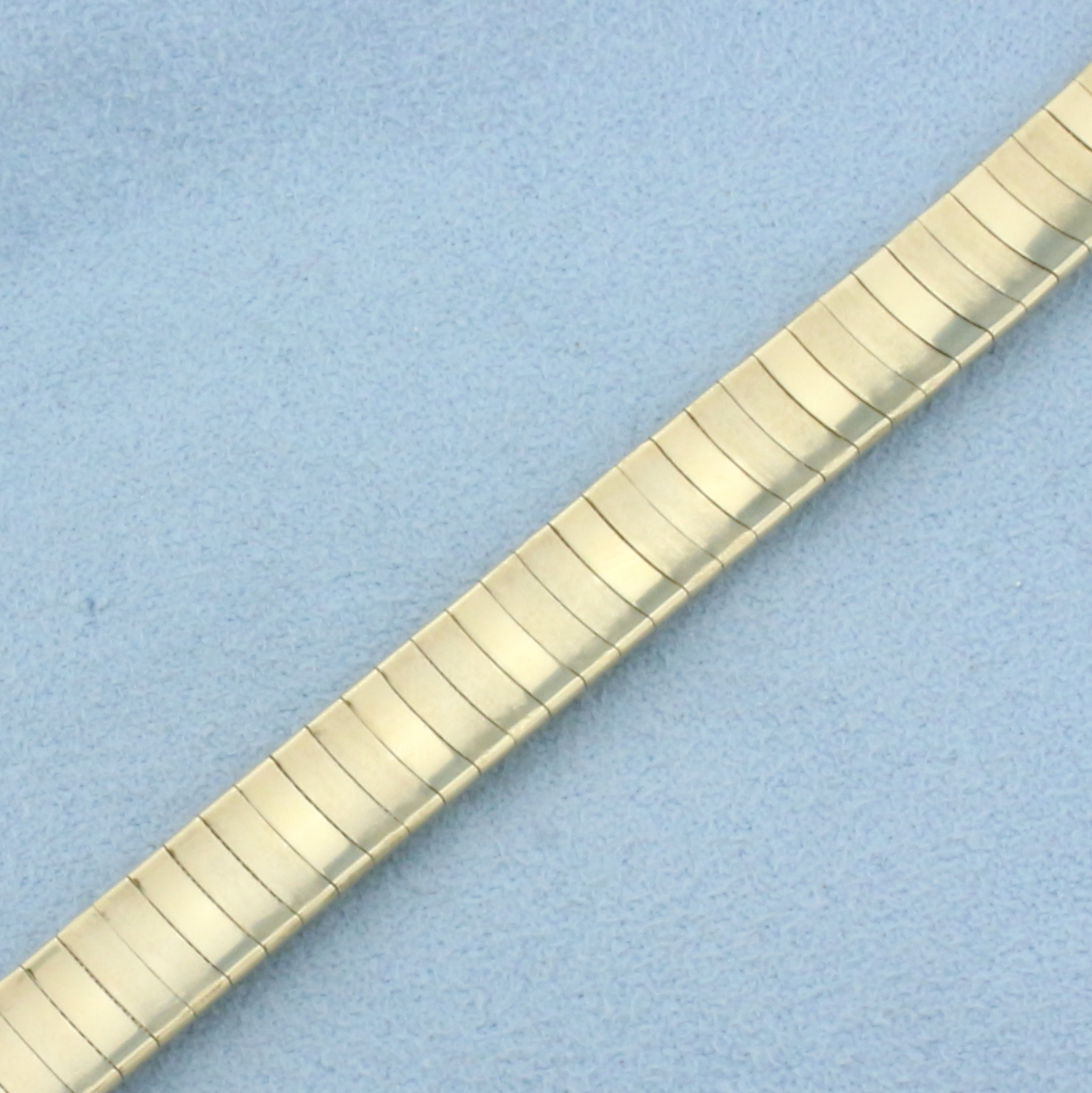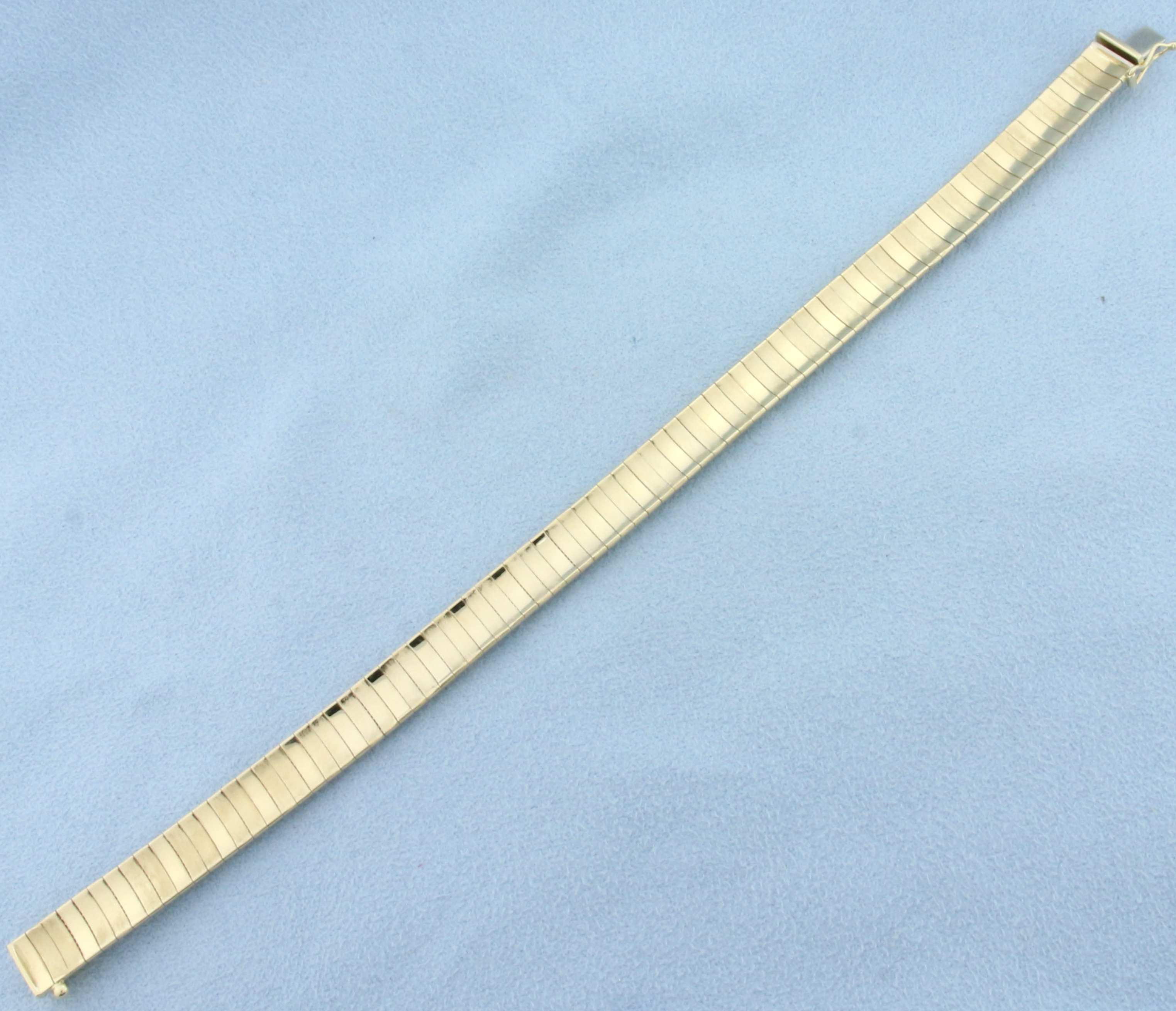 14k yellow gold. 7 inches long, 7.75mm wide. Safety clasp. 21.8g.