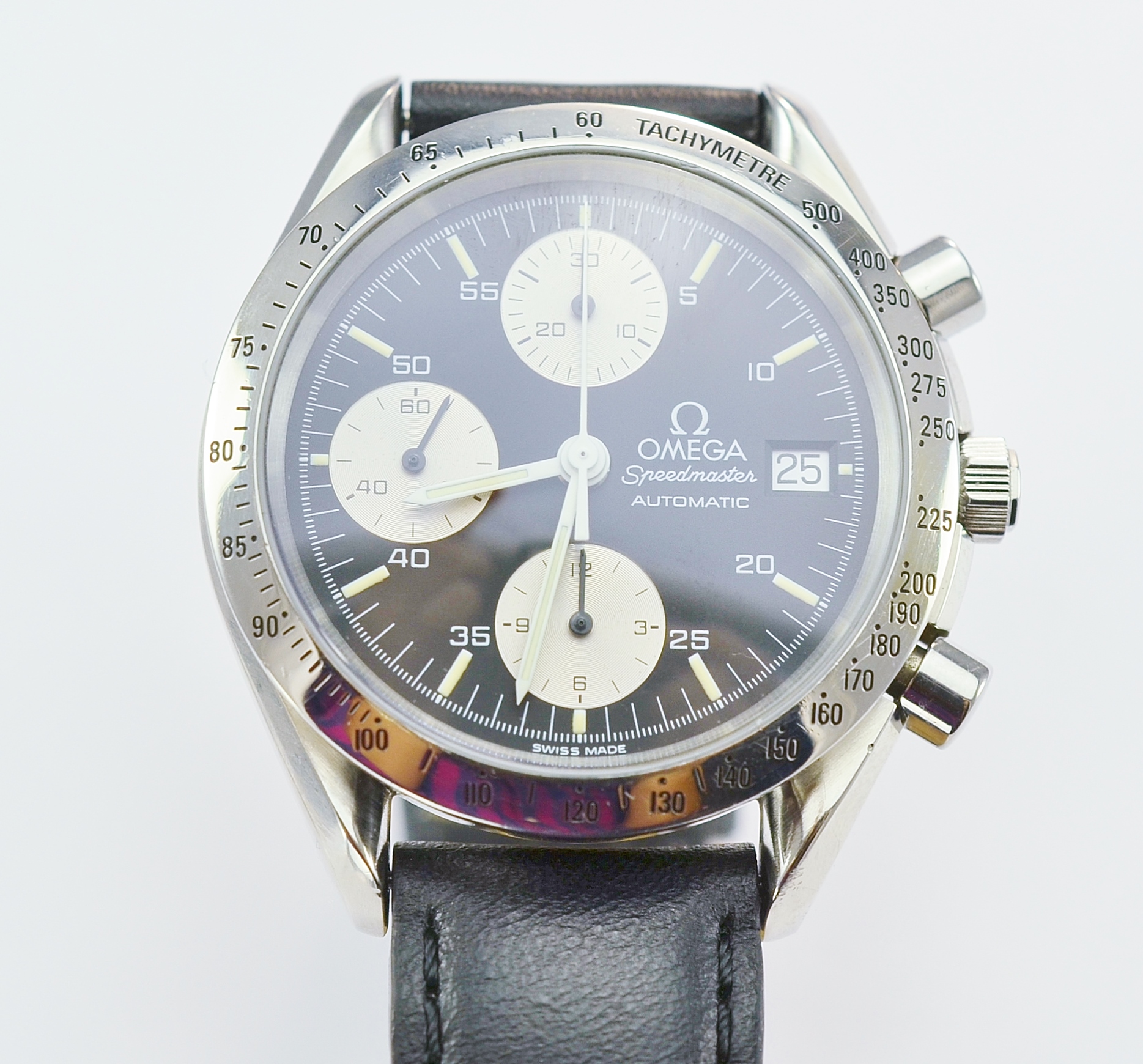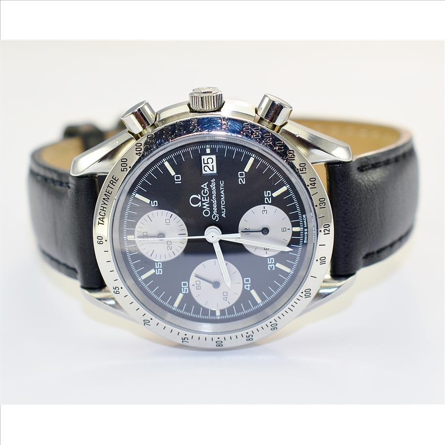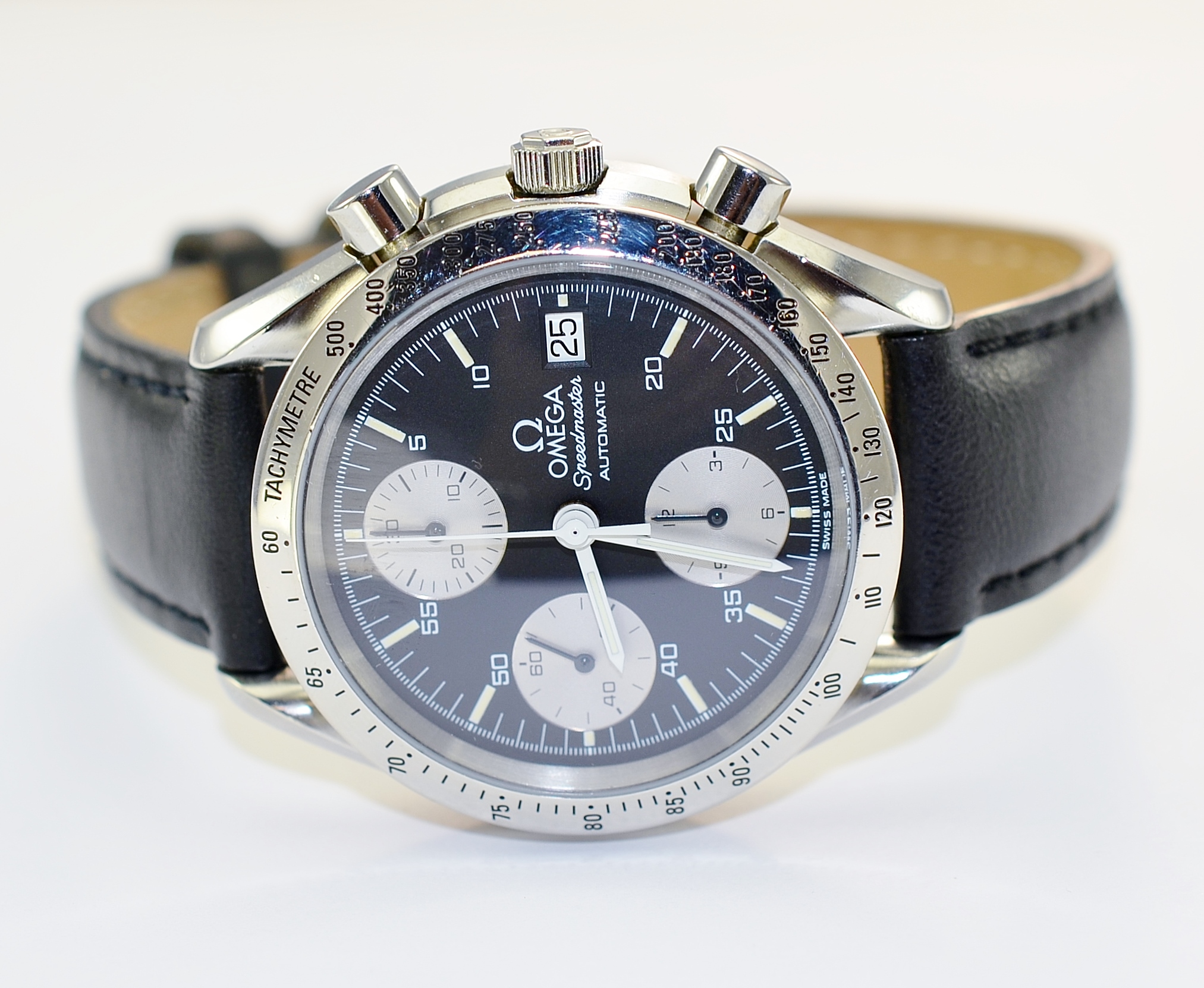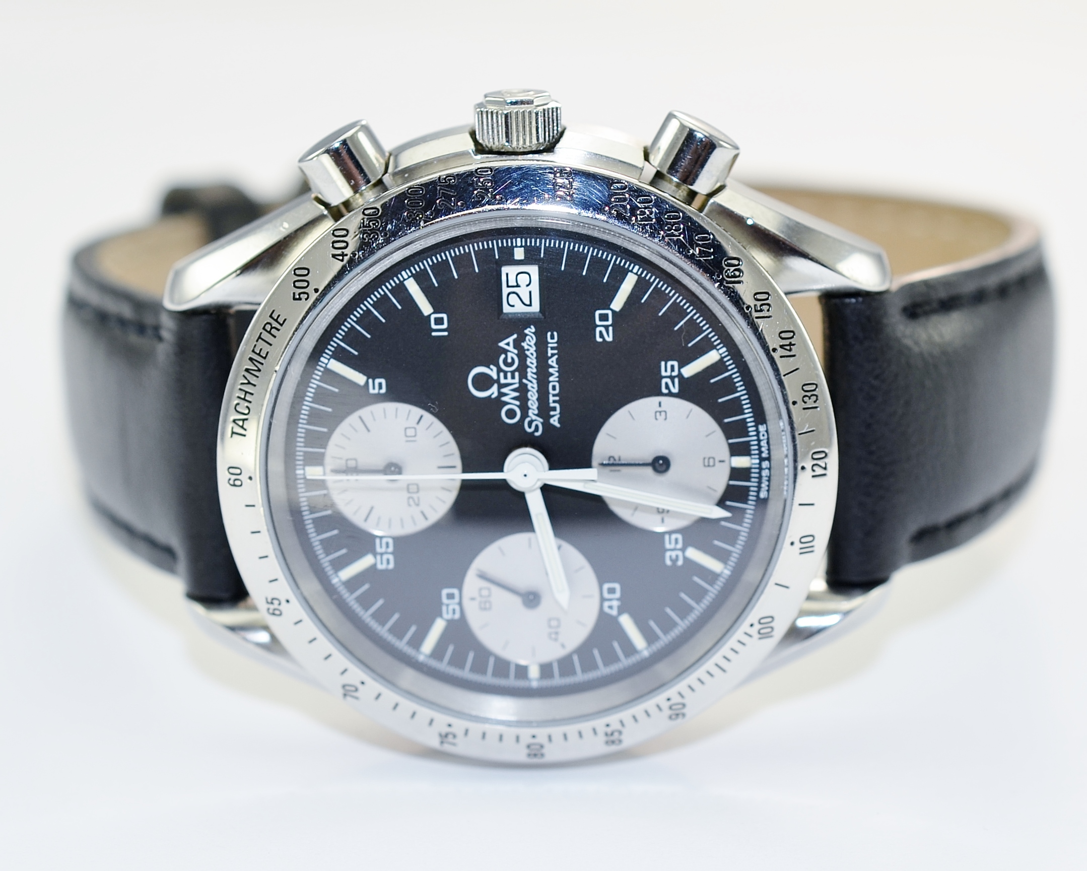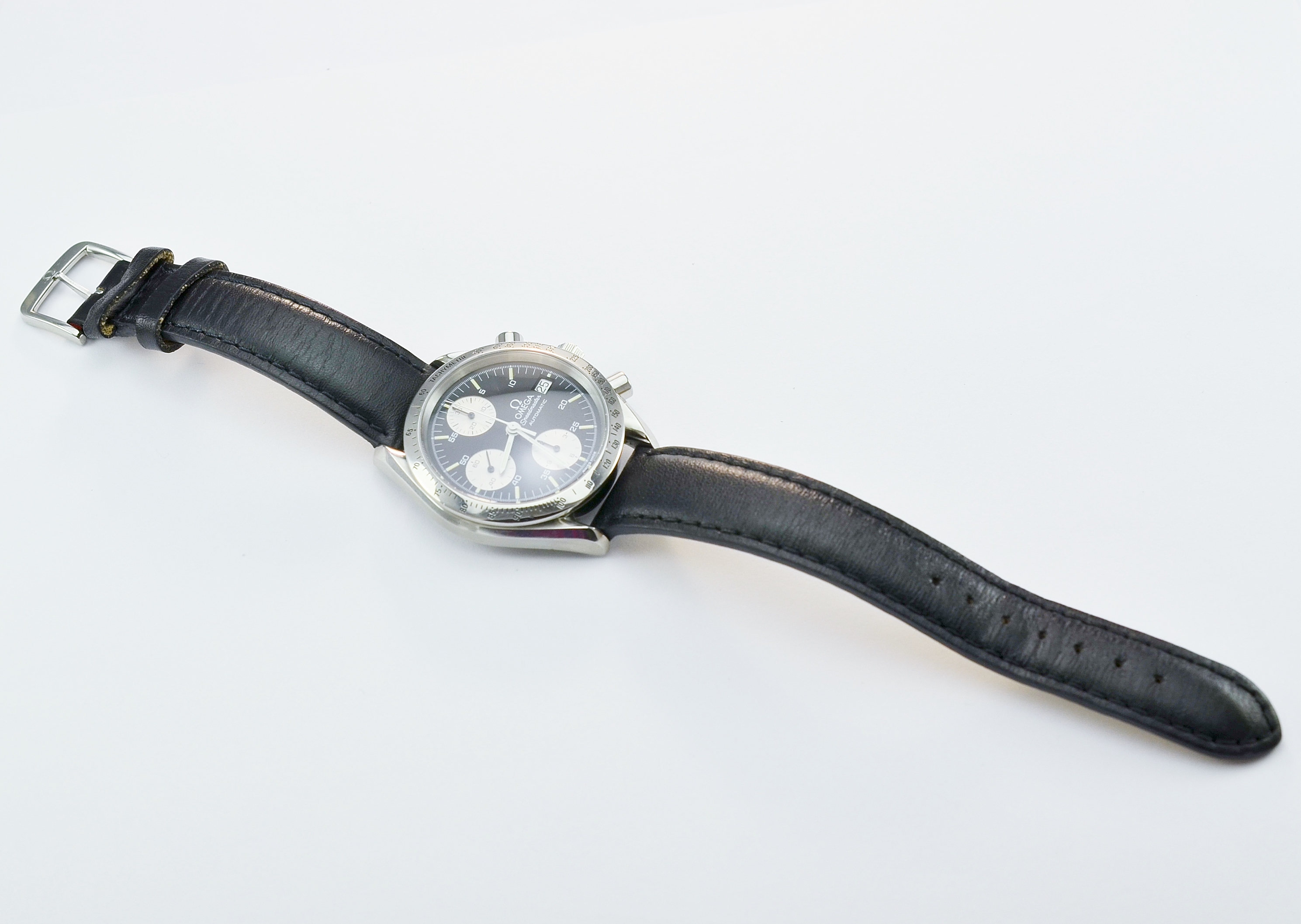 Omega Speedmaster Chronograph Stainless Steel Matte Black Dial Men's Watch on Black Leather Strap
