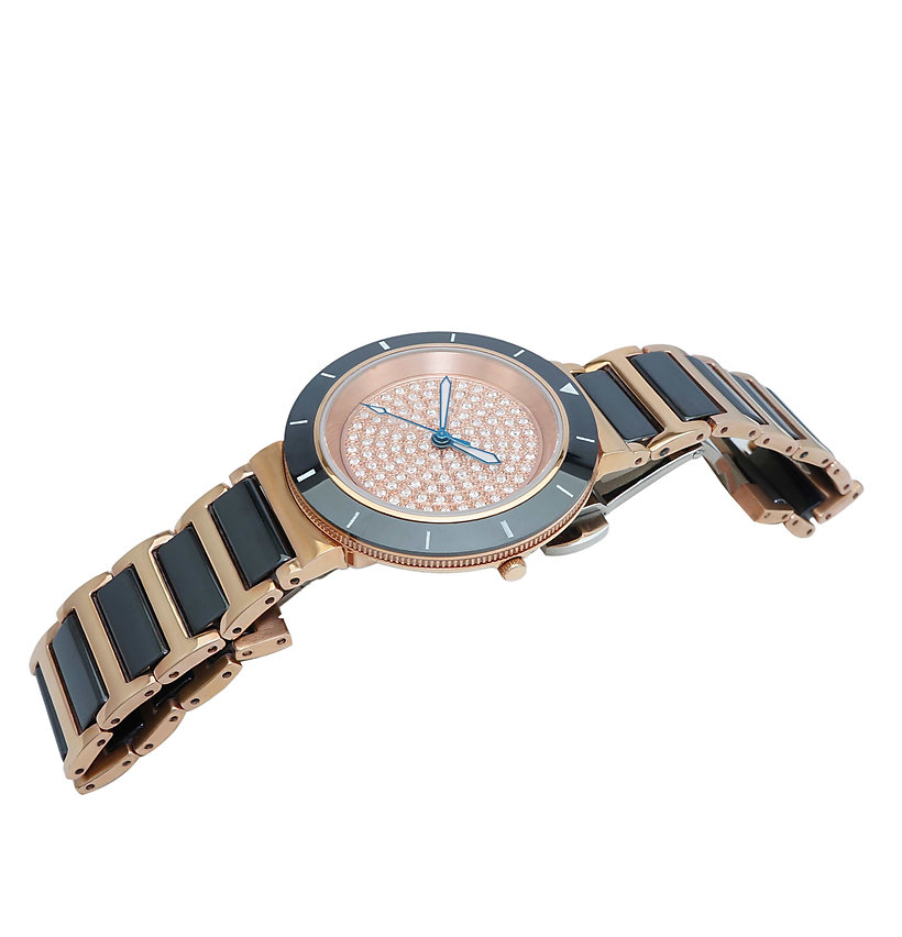 Band Material Black High-tech  Ceramic and Stainless Steel (Rose tone), with Push button butterfly deployment clasp.