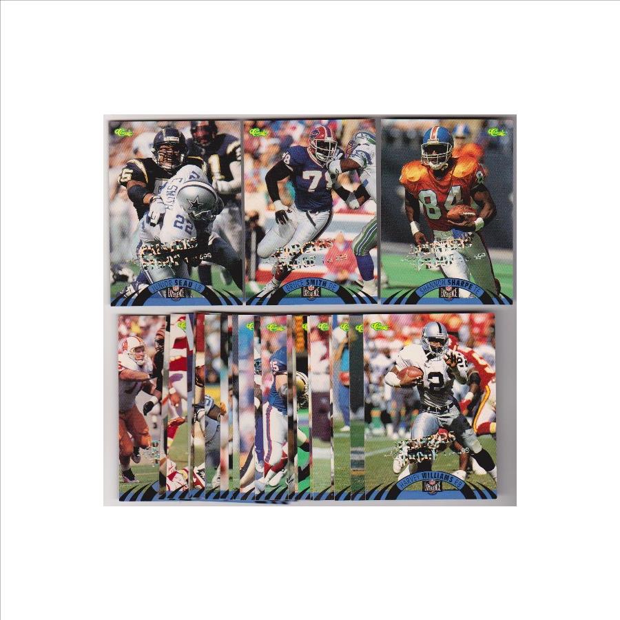 This is a collection of 25 different 1996 Classic NFL Experience Printer's Proof Insert cards. These say "1995 Classic Marketing" on the back, but they are actually a 1996 Classic NFL Experience Super Bowl XXX Insert Cards. Only 499 of each card was produced.  This lot includes Junior Seau, Bruce Smith, Shannon Sharpe, and more.  These average Near Mint condition. This is a nice low production insert card lot.