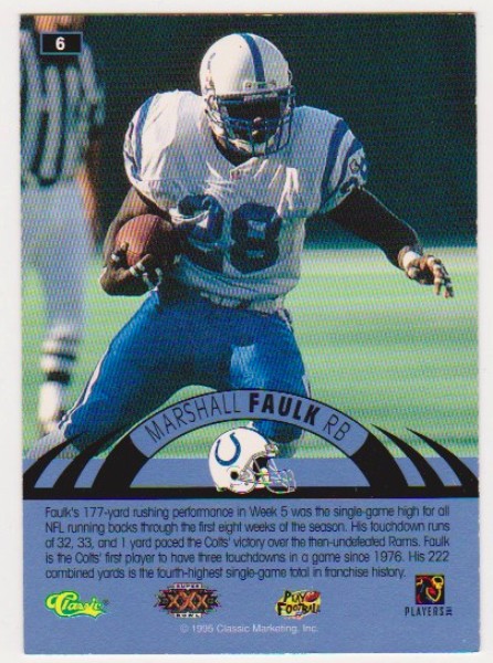 This is a 1996 Classic NFL Experience Printer's Proof Marshall Faulk #6 insert card.  These say "1995 Classic Marketing" on the back, but this is actually a 1996 Classic NFL Experience Super Bowl XXX Insert Card.  This was an extremely tough card to pull from packs as only 499 were produced.  It is in approximately EX-MT condition. It has minor wear, but overall displays nicely.