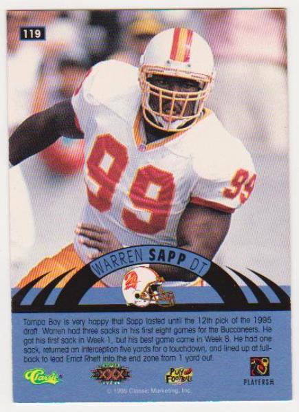 This is a 1996 Classic NFL Experience Printer's Proof Warren Sapp #119 Rookie insert card. These say "1995 Classic Marketing" on the back, but this is actually a 1996 Classic NFL Experience Super Bowl XXX Insert Card. This was an extremely tough card to pull from packs as only 499 were produced.  It is in approximately Near Mint condition.