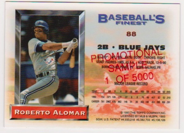 This is an original 1993 Topps Finest Roberto Alomar #88 promo card.  This was limited to only 5,000 produced.  It has some surface wear and is off center, but overall is a nice low production first year Topps Finest promo card of this baseball Hall of Famer.