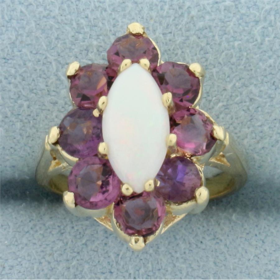 In 14k yellow gold. Contains one high quality natural marquise shaped opal gemstone, 10mmx5mm, with excellent play of color and flashes of pink, orange, green and yellow. Accented by eight high quality natural 4mm Tourmaline gemstones, with bright purple color and excellent clarity. Size: 4. 4.0g.
