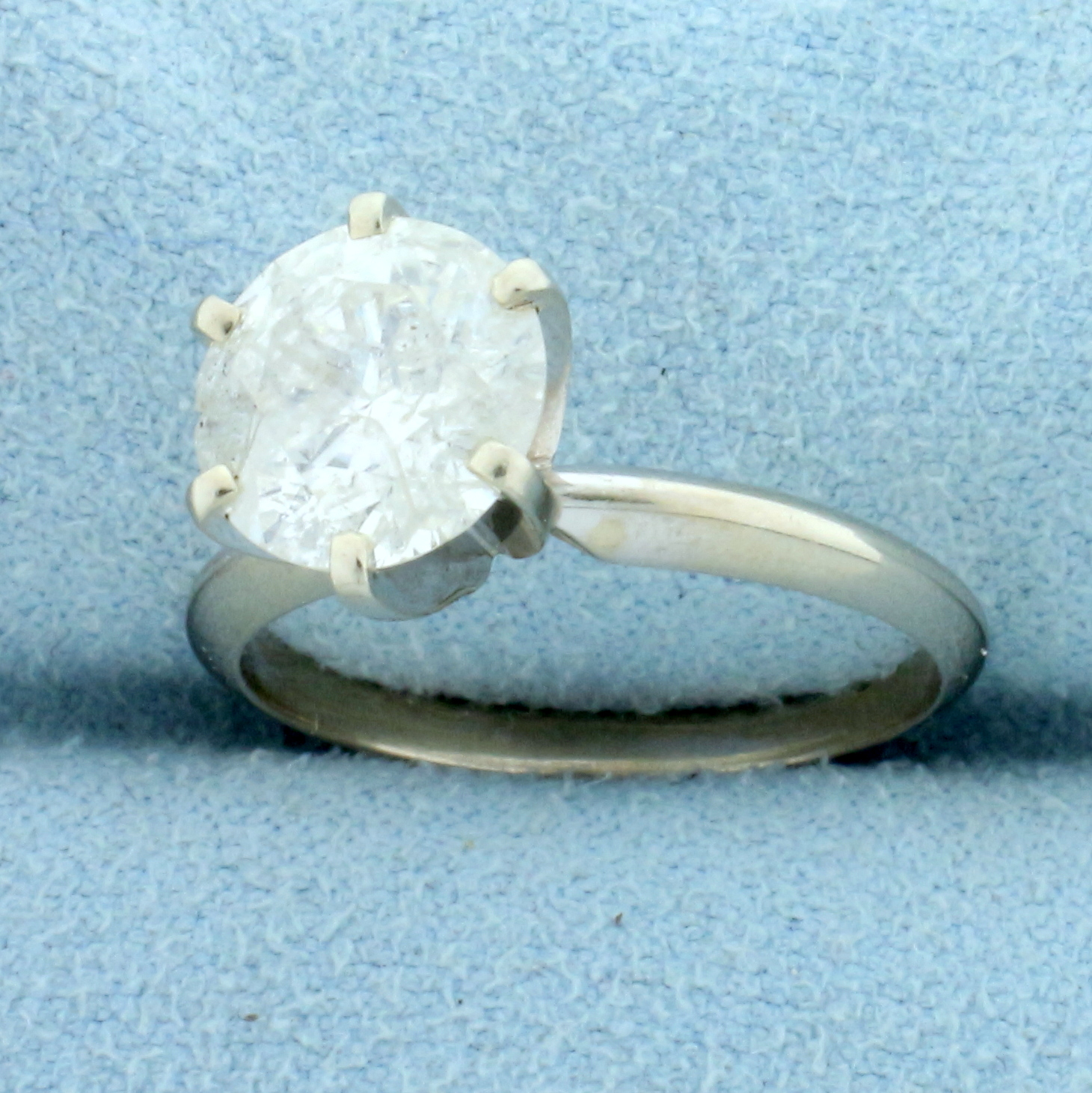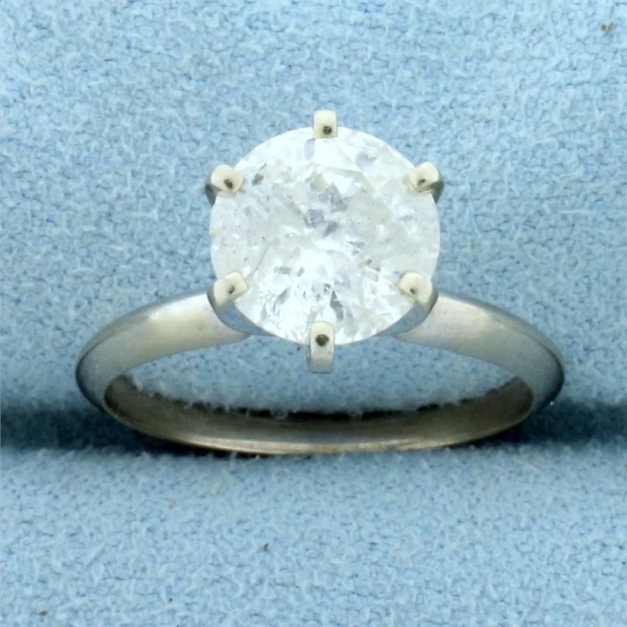 In 14K White Gold. Contains one high quality 2 1/3ct round brilliant cut Diamond, H color/I2 clarity. Stone faces up great and looks huge. Great value. Size 6 1/2. 2.9g