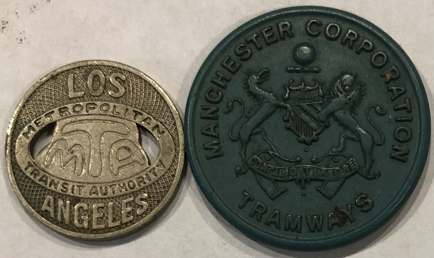 >Pair of Transit Tokens - Los Angeles and UK Manchester Corporation Tramways - 2 Tokens