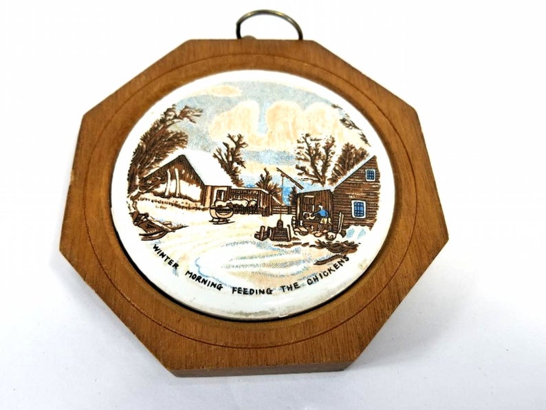 Hand painted and detailed pottery wall plate in a wooden plaque
