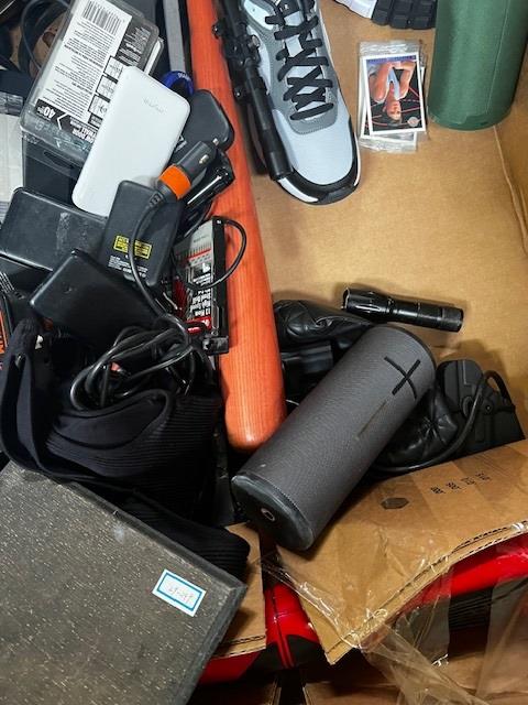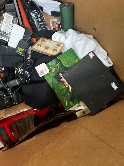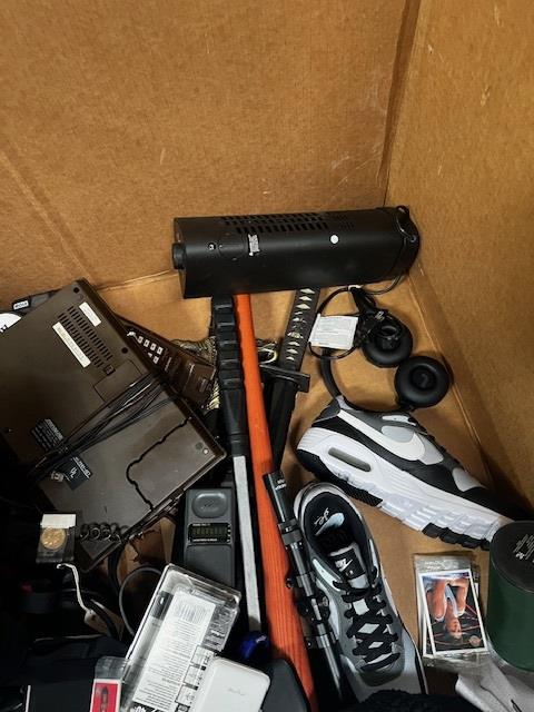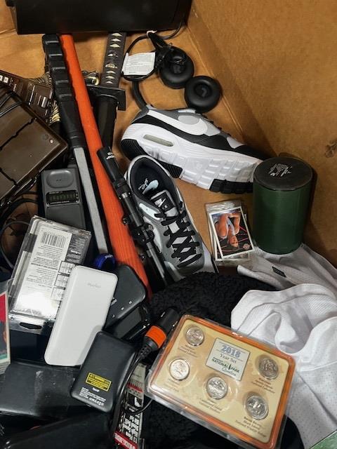 - Pallet includes clothing, Men's Nike shoes size 9, battery packs, Hoover board, replica swords, and more