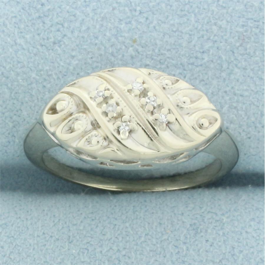 In 14k white gold. Center design is 16mm by 9mm. Contains six high quality 1/2pt diamonds. Knife edge shank design. Size: 5.5. 3.2g.