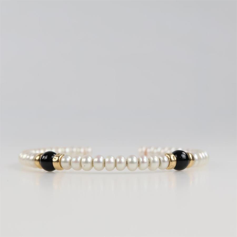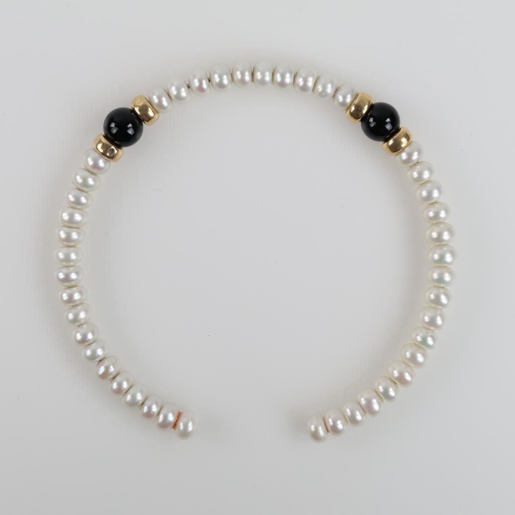 Pearl 14kt Gold Hollow Bead Black Bead Accents Open Back Bangle