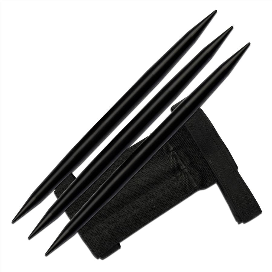 SPECIAL FEATURES: Set of 3 Throwing Spikes, Black Oxidized Stainless Steel Blades, Full Tang Construction, Black Oxidized Stainless Steel Handles, Includes Nylon Sheath with Arm/Leg Strap for Easy and Safe Transport.