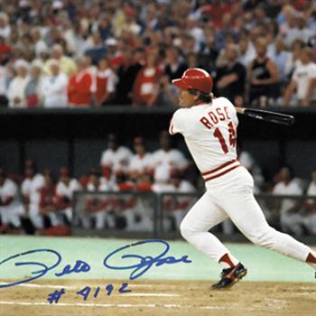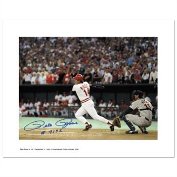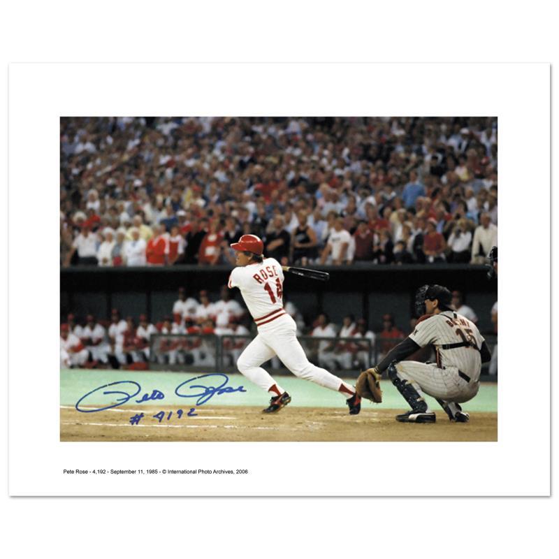 This image features Pete Rose hitting his record breaking 4,192 hit on September 11, 1985. In commemoration of this 25 year anniversary, 500 pieces were hand-signed by Pete Rose. Includes Certificate of Authenticity. Measures approx. 20" x 16" (image).
