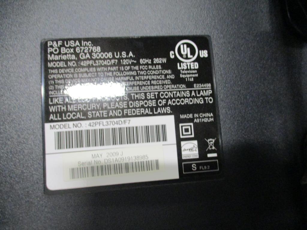 Get a great deal with this online auction presented by PropertyRoom.com on behalf of a law enforcement or public agency client. Model: 42FL3704D1F7 Screen Size: 42" Date of Manufacture: May 2009 Measurements: 29" T X 40" W X 5" Base: N Remote Control: N Power Cord: N Physical Condition: Fair, scratches, niks, dirty, missing Base. Testing Results: Item was tested for power only and it powered on, displayed menu. Input and output ports were not tested and may be non-functional. Item is sold "As Is".