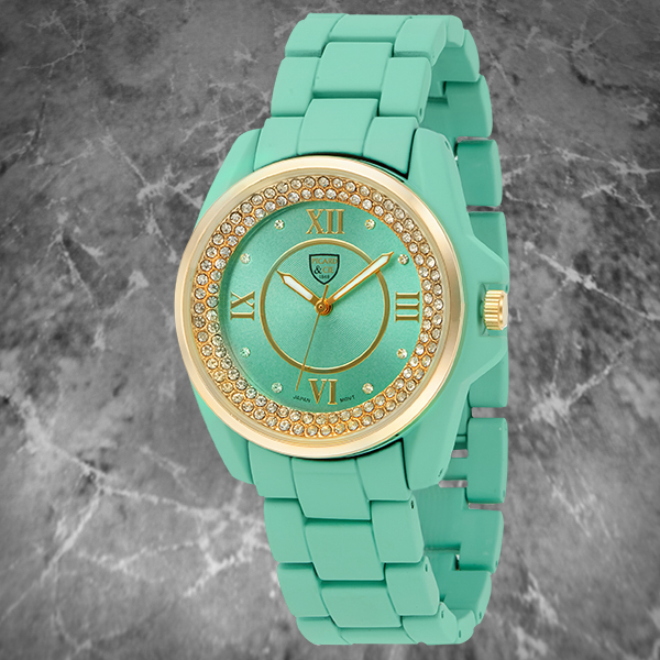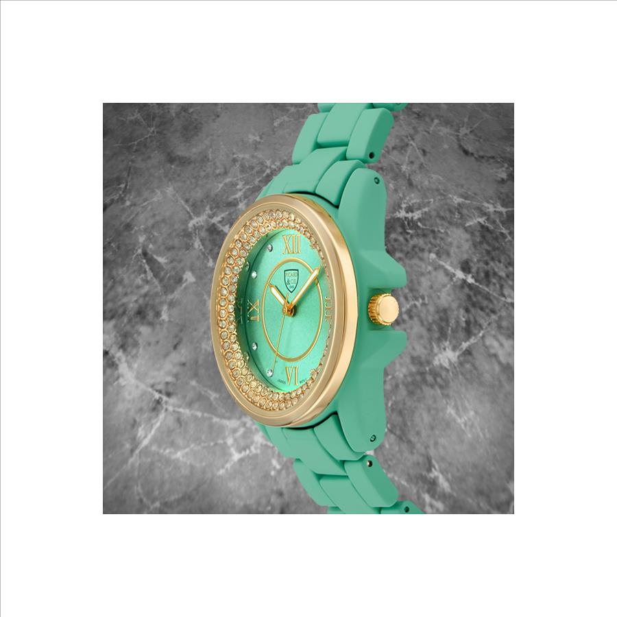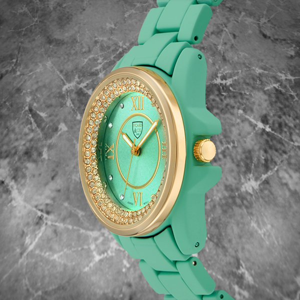 Inviting mint green cascades over the entire Eleanor in a contemporary display of vibrant color. Stunning Swarovski crystals rest in a golden setting as they surround the bezel in a grand sophisticated style, while shimmering with every ray of light that bounces off them. The mint green case and bracelet unite with the stainless steel case back to create an emblematic watch, worthy of the revered Eleanor Roosevelt. Bask in the radiance of "one of the most esteemed women in the world" and "the object of almost universal respect" when you take home the brand new Eleanor watch from Picard & Cie.