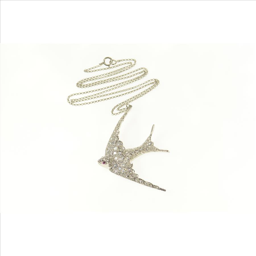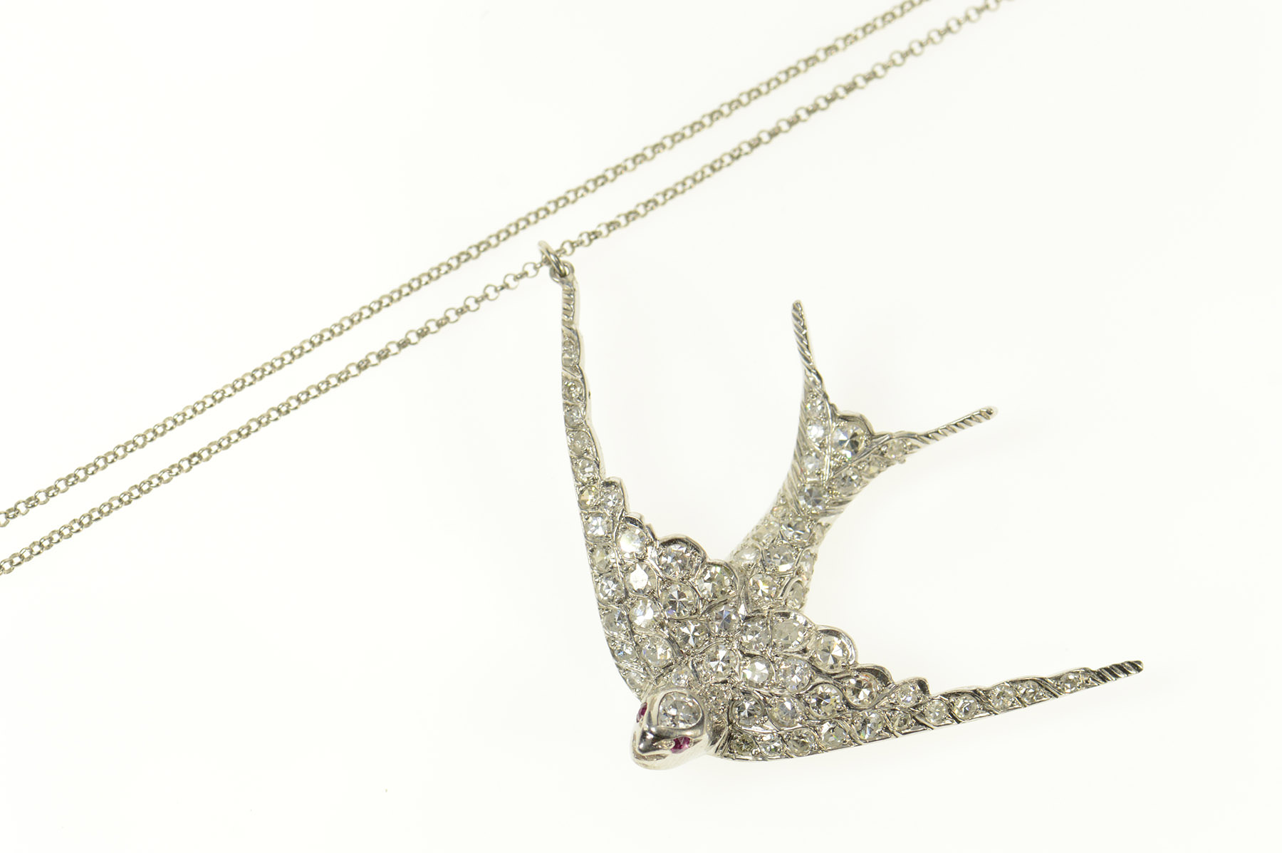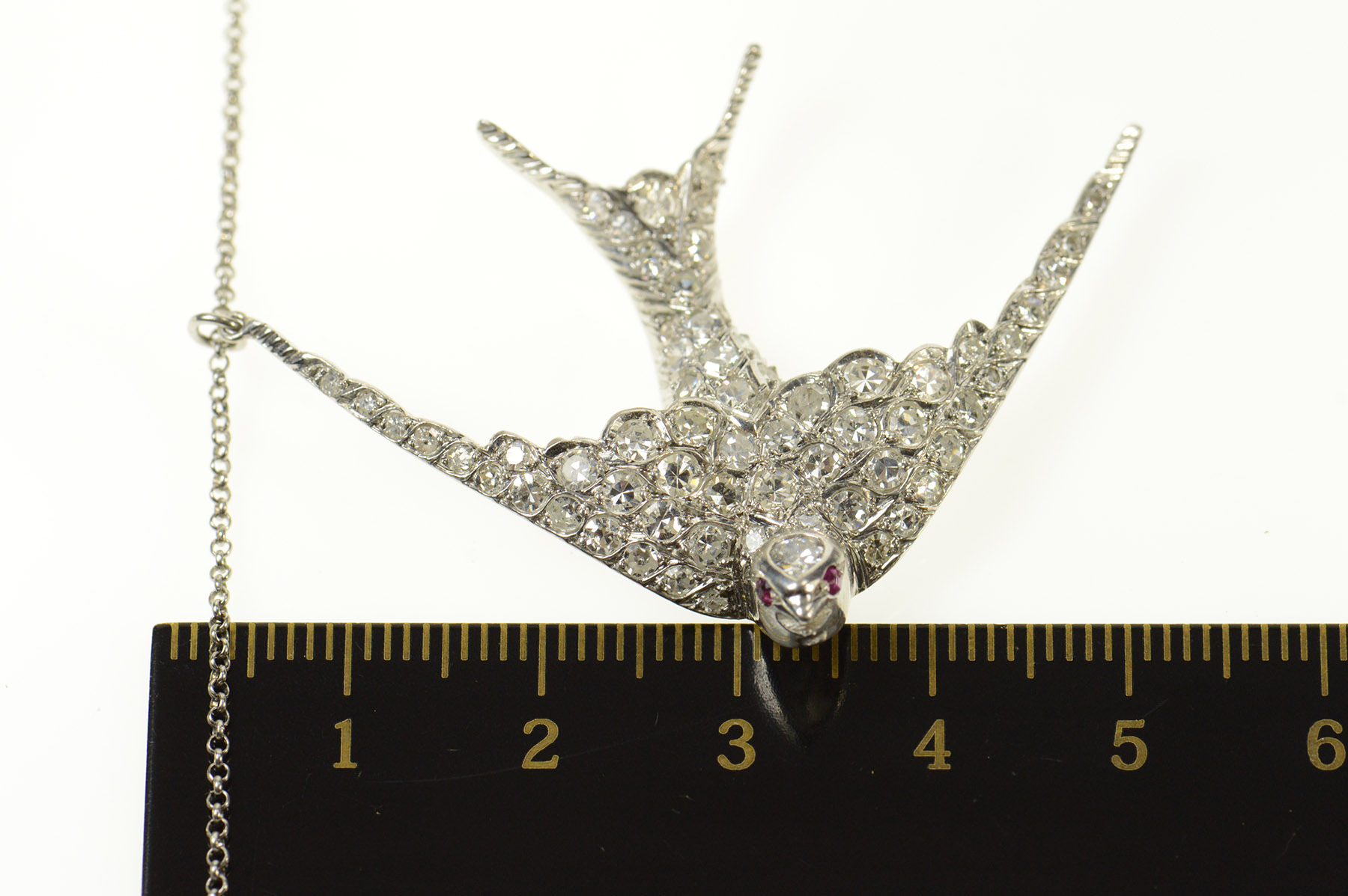 Platinum 3.06 Ctw Pave Diamond Ruby Sparrow Bird Necklace 18.25"