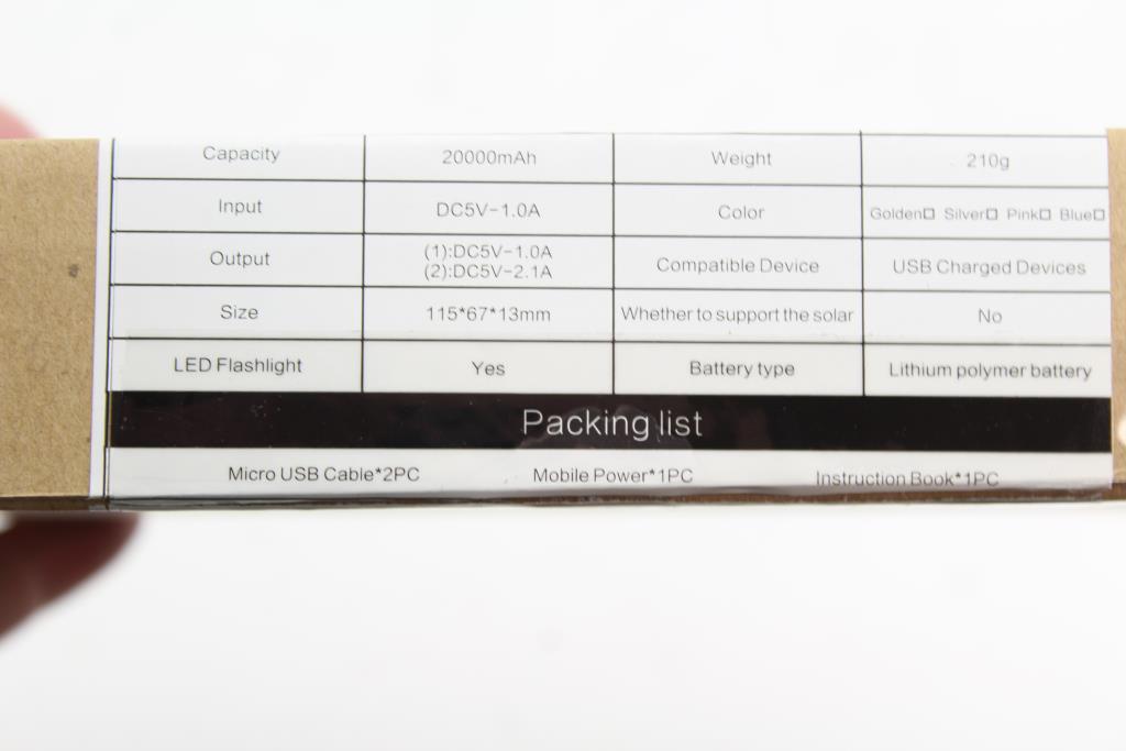 - White, 20,000 mAh, 210g, flashlight