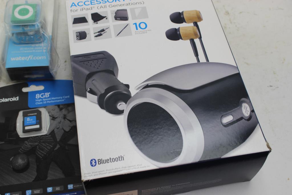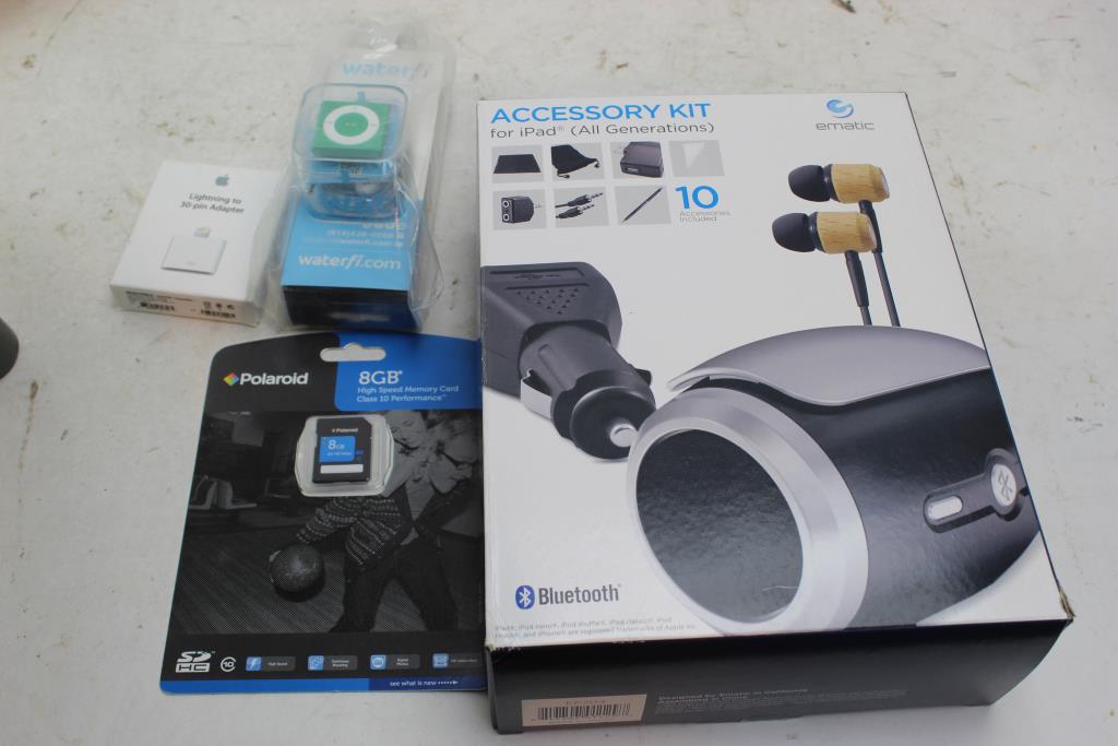 Get a great deal with this online auction for an electronics lot presented by Property Room on behalf of a law enforcement or public agency client. - Polaroid 8GB Sd Card, Ematic Ipad Accessory Kit, Waterfi Shufle And More: 4 Items