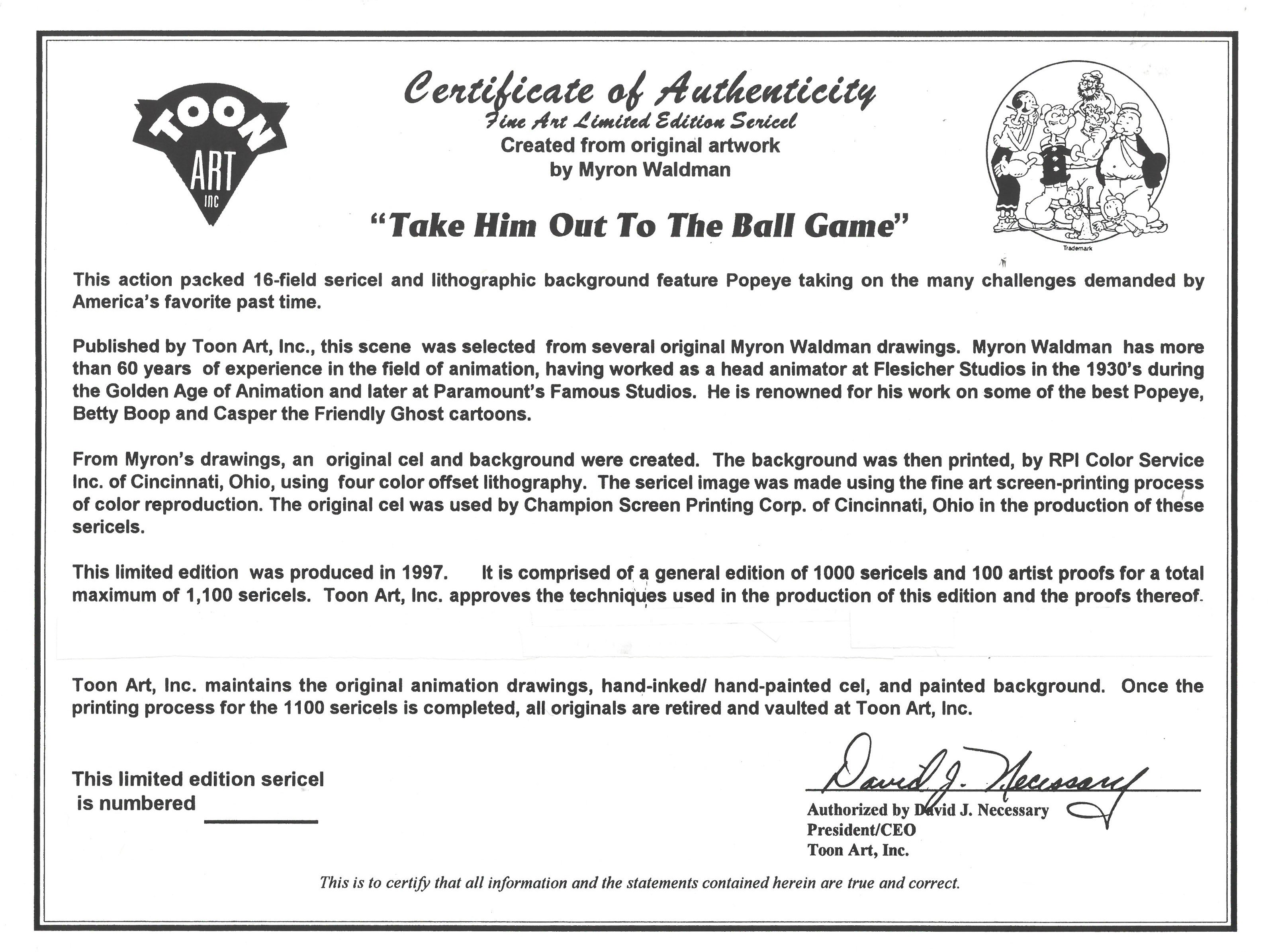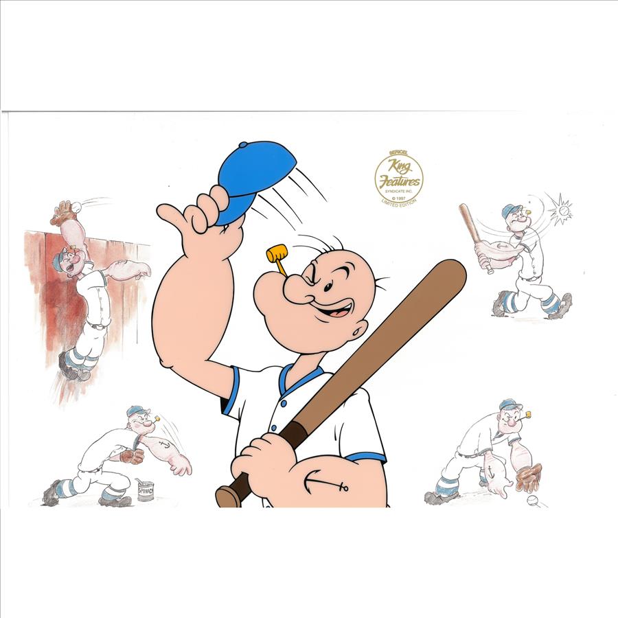 Taken from several original drawings by long-time animator Myron Waldman.  This action packed 16-field and lithographic background is entitled "Take Him Out to the Ballgame" and features Popeye taking on the many challenges demanded by America's favorite past time.  This sericel with ltihographic background was authorized by King Features Syndicate.  Myron Waldman. Waldman (deceased) had over 70 years of experience in the field of animation, having worked as a head animator at Fleischer Studios in the 1930's during the Golden Age of Animation and later at Paramounts' Famous Studios.  He is renowned for his work on some of the best Popeye, Betty Boop and Casper the Friendly Ghost cartoons.  16x13
