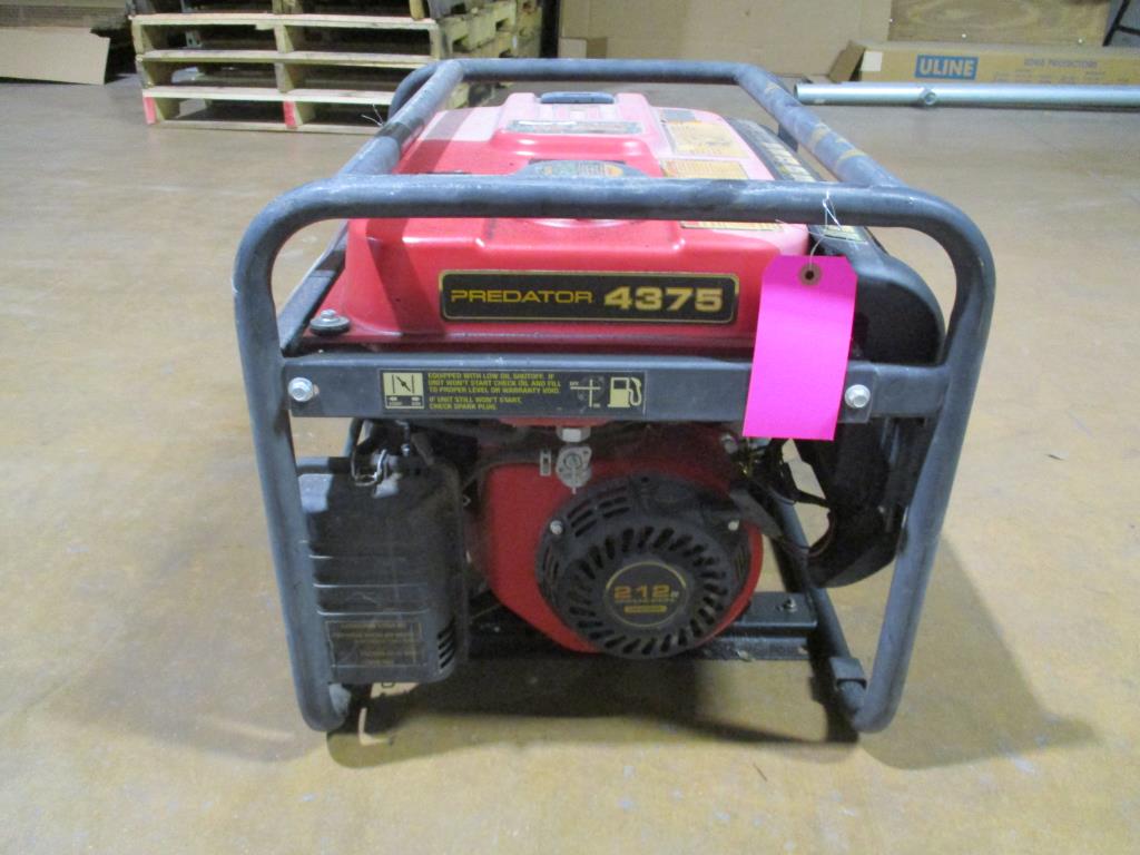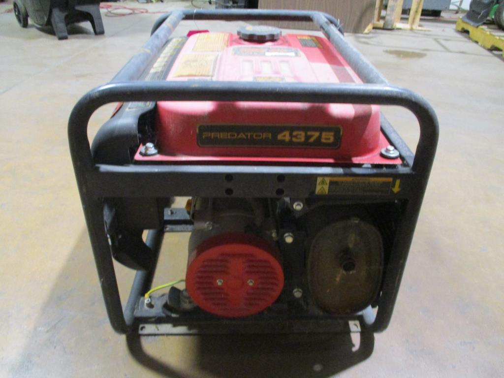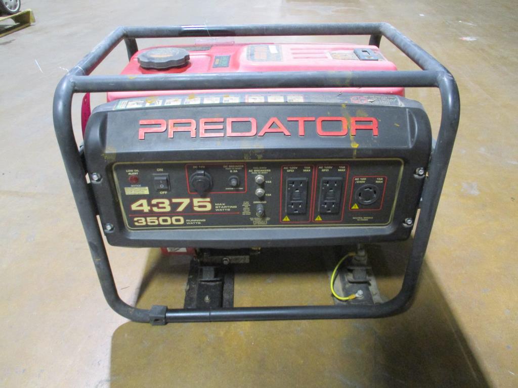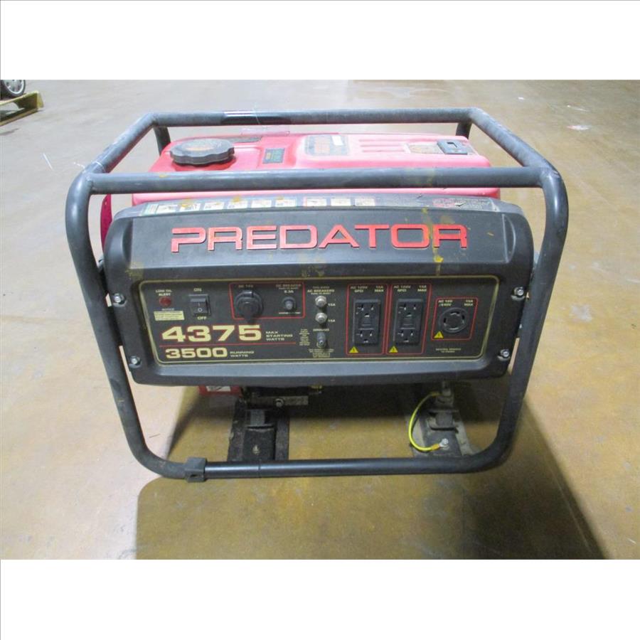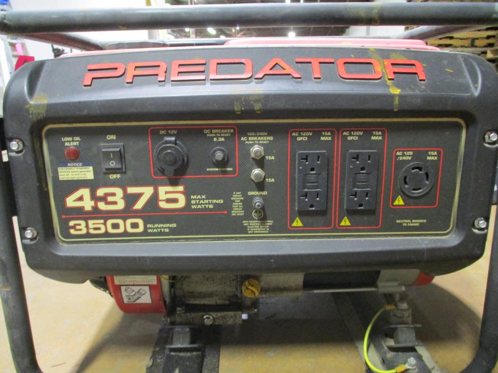 - gas powered, pull cord start, predator engine 212CC OHV, on and off switch, low oil light, DC 12V plug, DC breaker 8.3amps, 2 120 X 240V AC breaker, 12 amps, 2 dual AC 120V 15 amp plugs, 4375 Max starting watts, 3500 Running watts