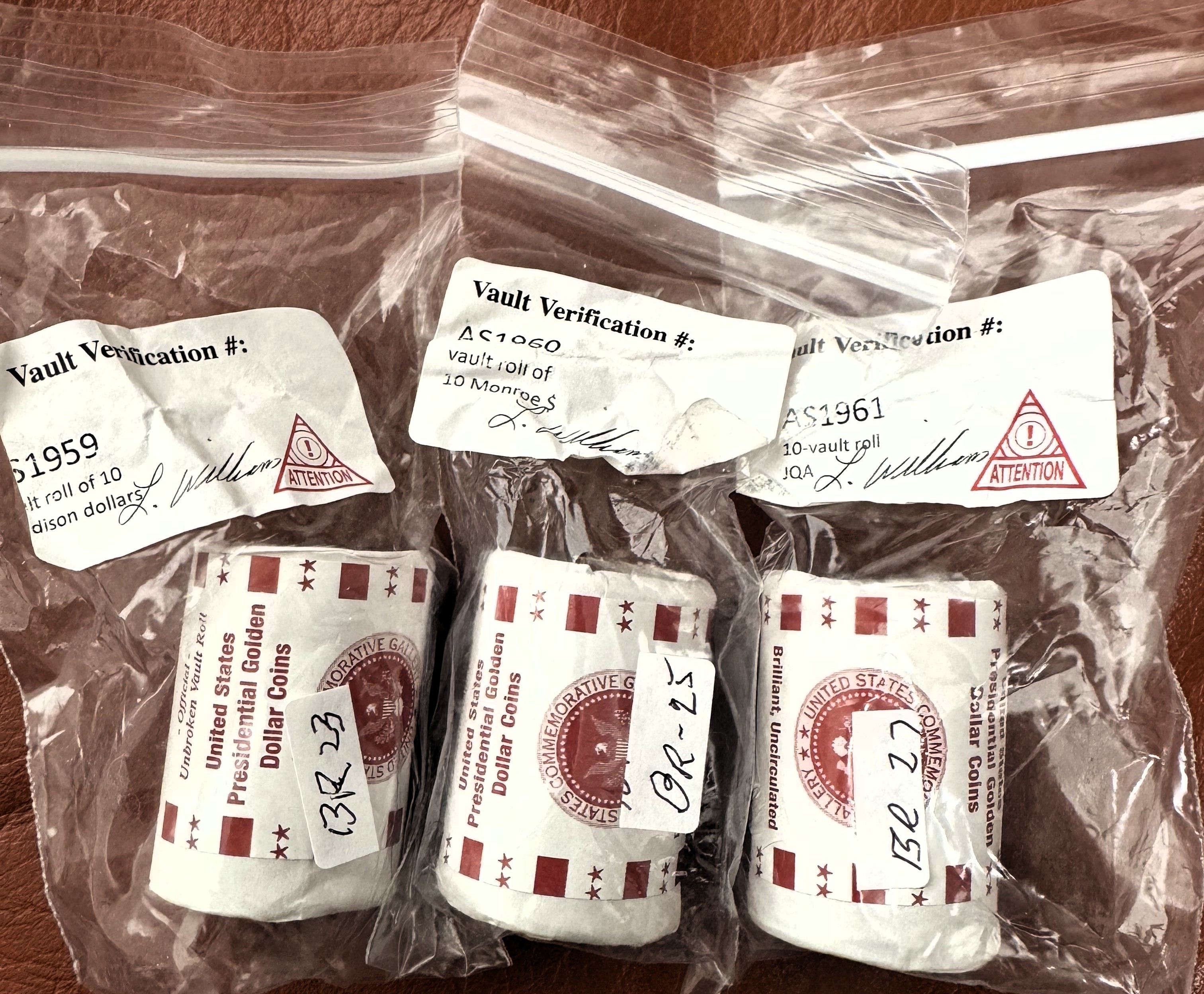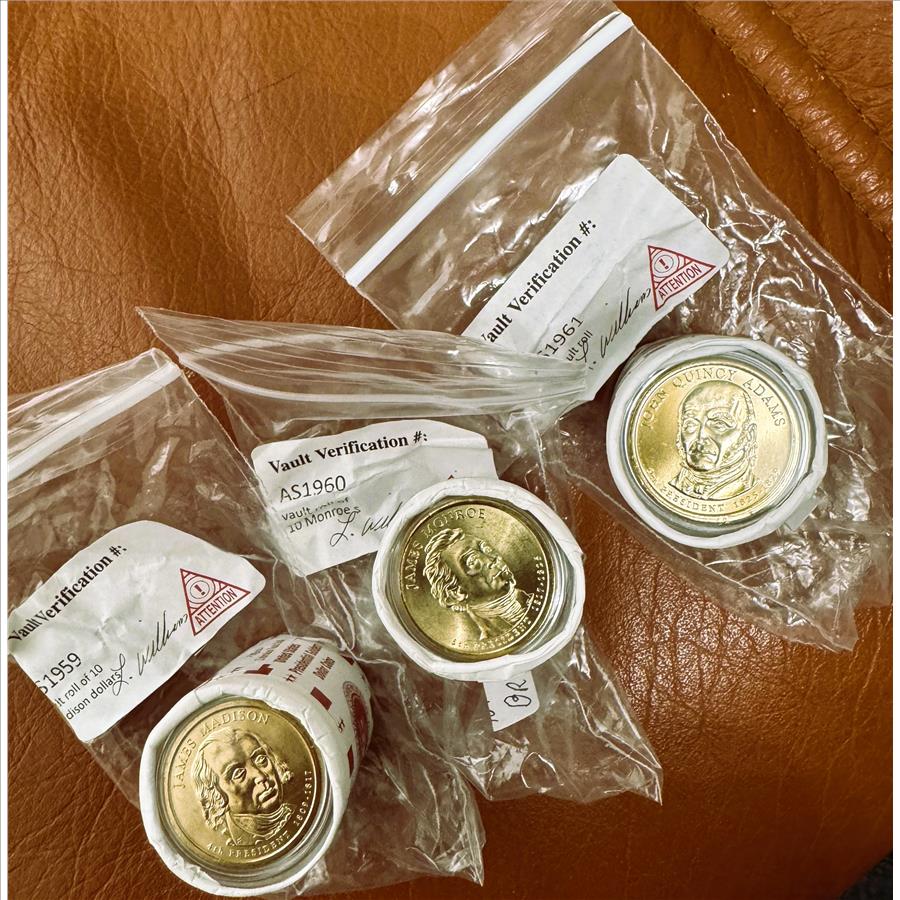 PRESIDENTIAL GOLDEN $1 DOLLAR GEM COINS, BU IN OFFICIAL UNBROKEN VAUGHT 3 ROLLS OF 10, MADISON, MONROE, & JOHN QUINCY ADAMS,