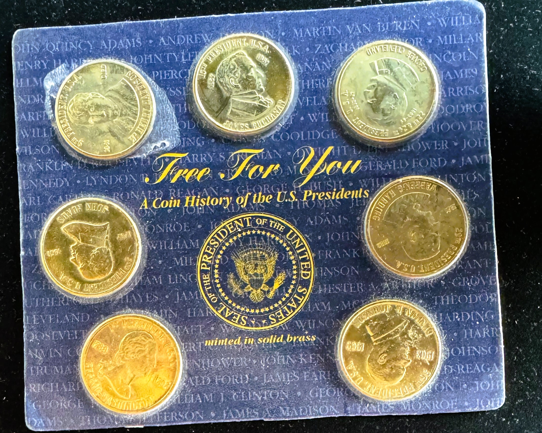 PRESIDENTS OF THE U.S. COIN HISTORY, COLLECTION SET OF 7, MINTED IN SOLID BRASS, ORIGINAL SEALED PKG
