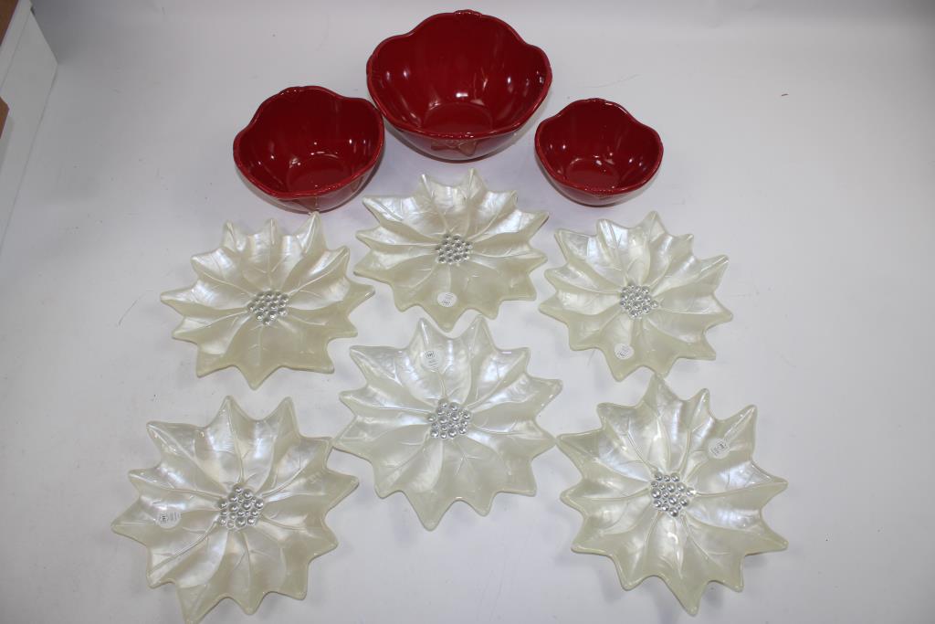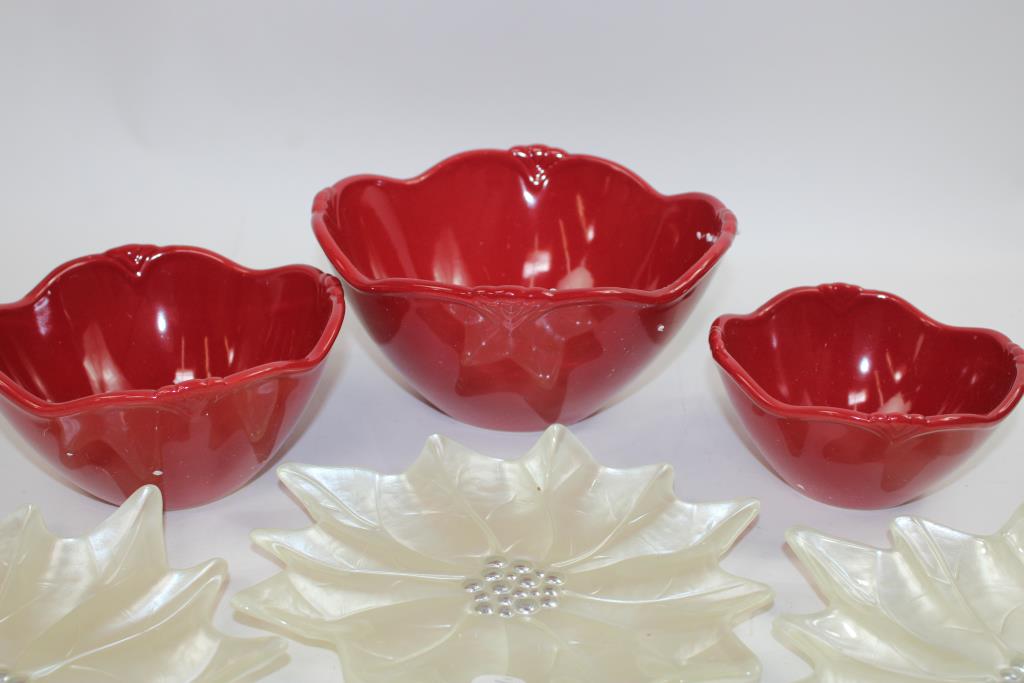 Princess House Red Pavillon 3 Piece Serving Bowl Set And Princess House Holiday White Poinsettia Dessert Plates (6)
