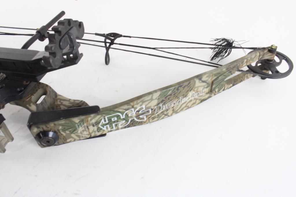Get a great deal with this online auction presented by PropertyRoom.com on behalf of a law enforcement or public agency client. Model: Thunderbolt Color: Camo Bow Length: 40" Draw Length: 29" Draw Weight: 70lb Peak Draw: Right Accessories: None Cosmetic Condition: Good with scratches Shipment by PropertyRoom to any jurisdiction does not mean this item is legal in such jurisdiction. It is your responsibility to have knowledge of, obey, or comply with all applicable laws relating to this item.