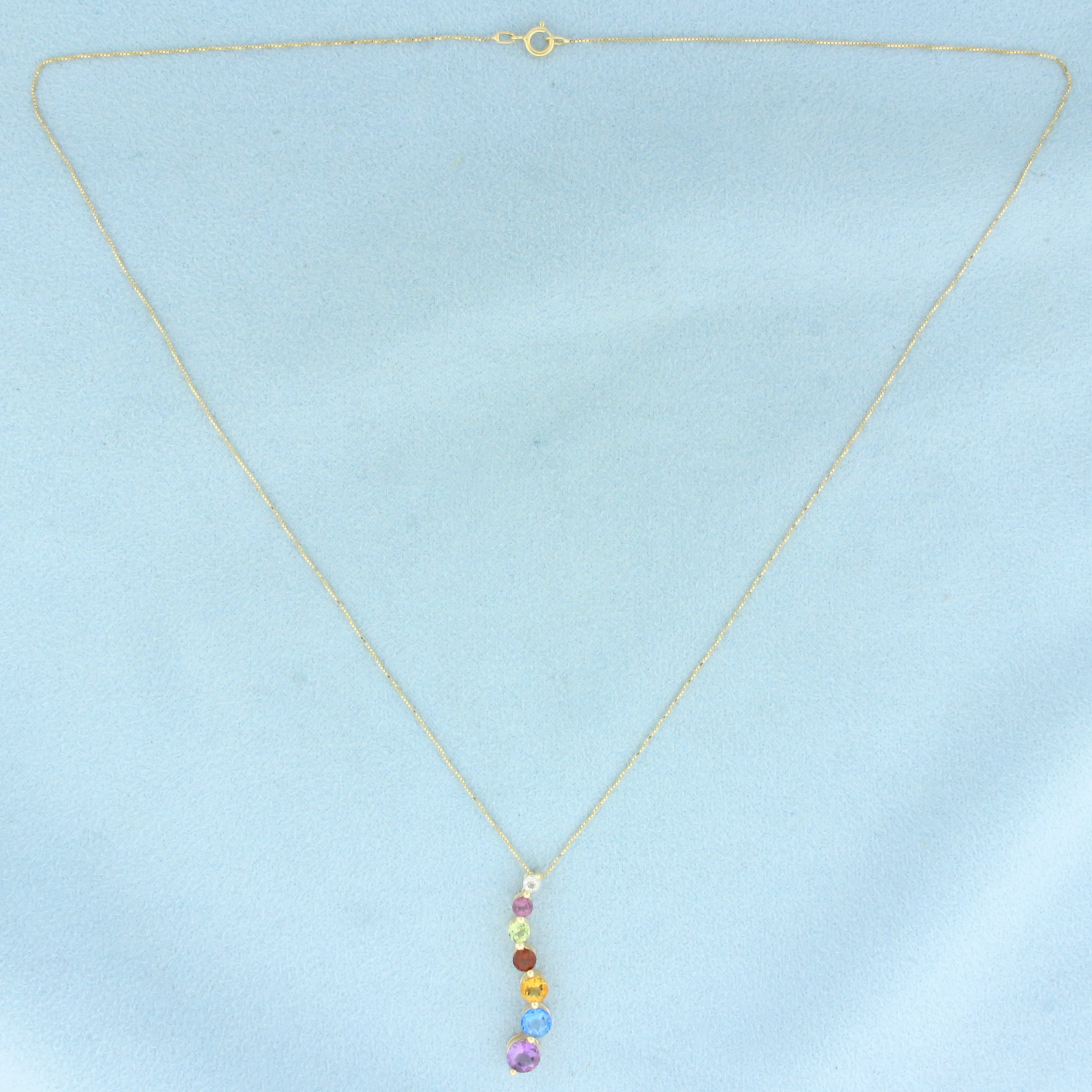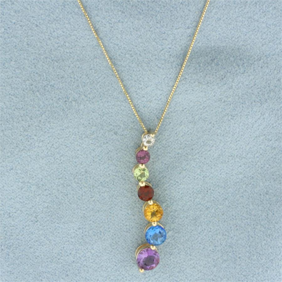 In 14k Yellow Gold. Contains seven high quality natural gemstones with vibrant color and excellent clarity: amethyst - 5mm, swiss blue topaz - 4.5mm, citrine - 4mm, garnet - 3.5mm, peridot - 3.2mm, pink topaz - 3mm, and white sapphire - 2.5mm. 18 inch long chain. 1/2mm wide. 18 inch box link chain. Spring clasp. Pendant is 1 1/8 inch long. 2.5g.
