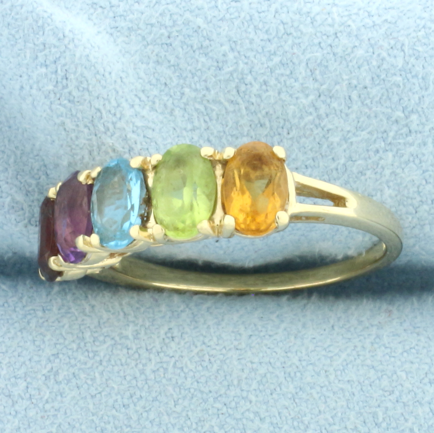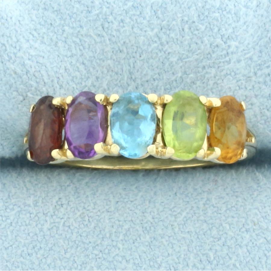 In 14k Yellow Gold. Contains five high quality natural 6mmx4mm gemstones: garnet, amethyst, blue topaz, peridot, and citrine, all with intense color and excellent clarity. 3.3g.