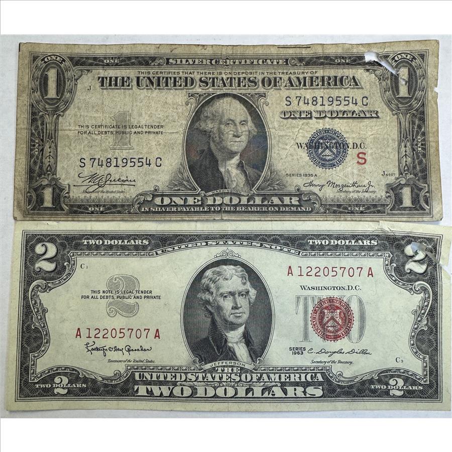 RARE 1935A $1 "S" Experimental Silver Certificate and 1963 $2 Red Seal U.S. Note
