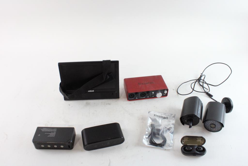 - Speakers, cables, earbuds, focusrite mixer, RCA screen & more