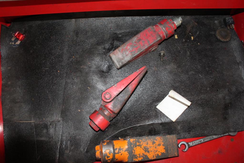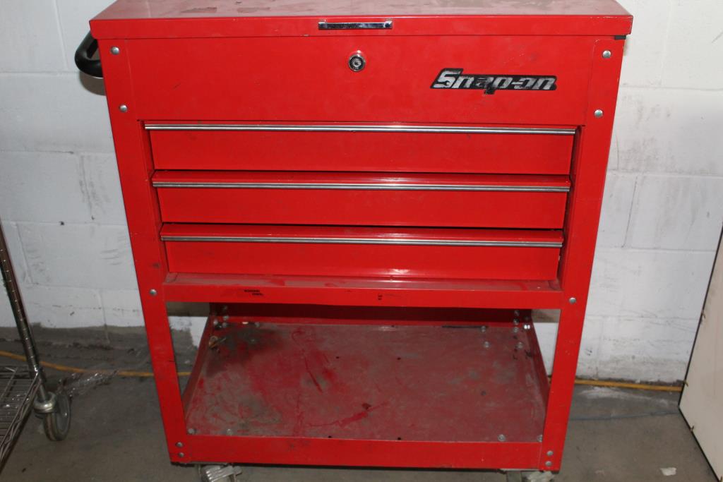 Get a great deal with this online auction for a tool box presented by Property Room on behalf of a law enforcement or public agency client. - Red Snap-On rolling tool box with liftup lid, three 27" x 18" drawers, and 20" x 332" bottom storage rack