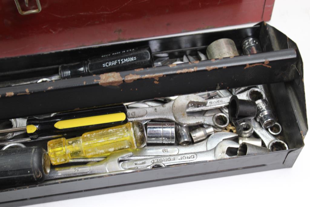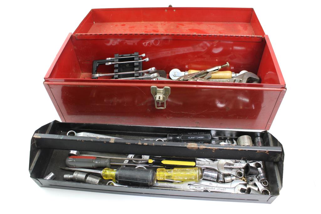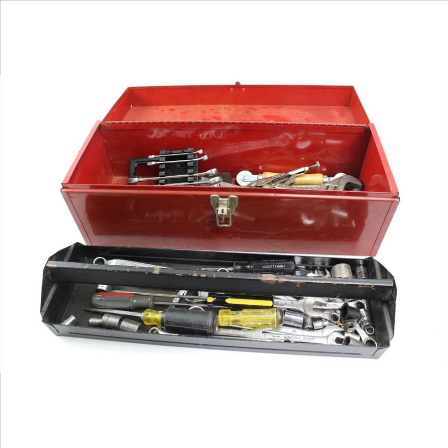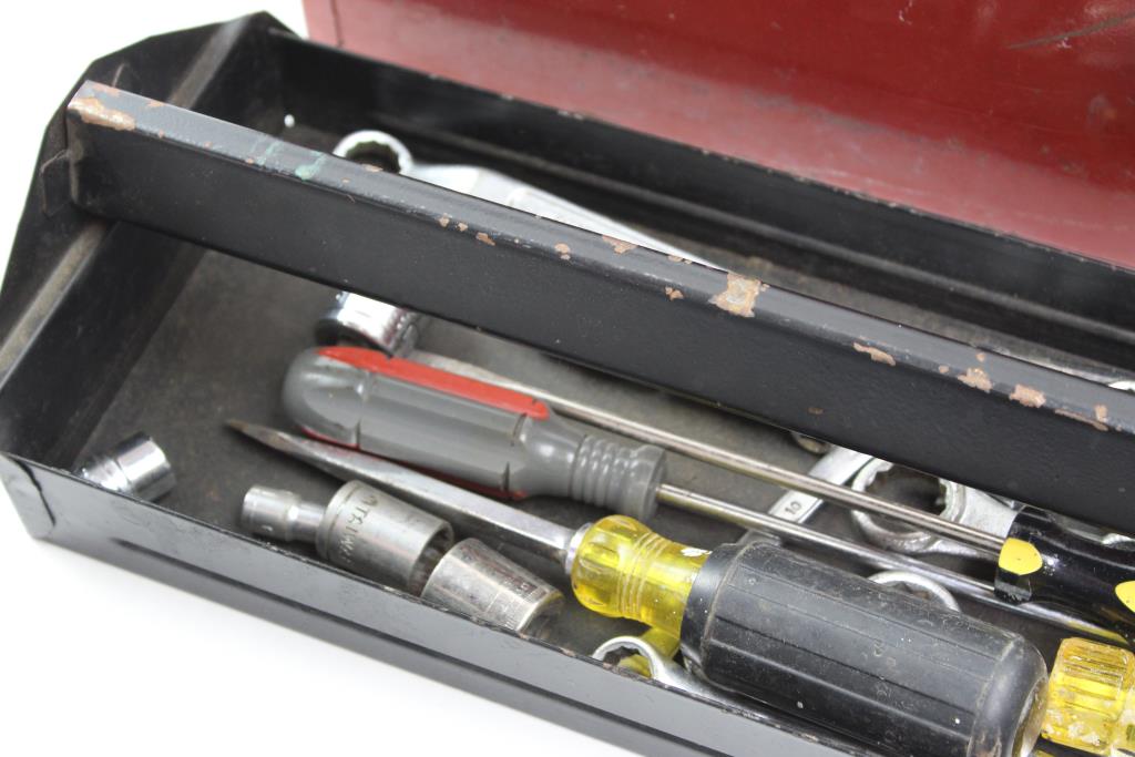 Get a great deal with this online auction for tools presented by Property Room on behalf of law enforcement or public agency client. - Red metal toolbox, brand unknown, dimensions aprox. 19" x 7" x 7"
