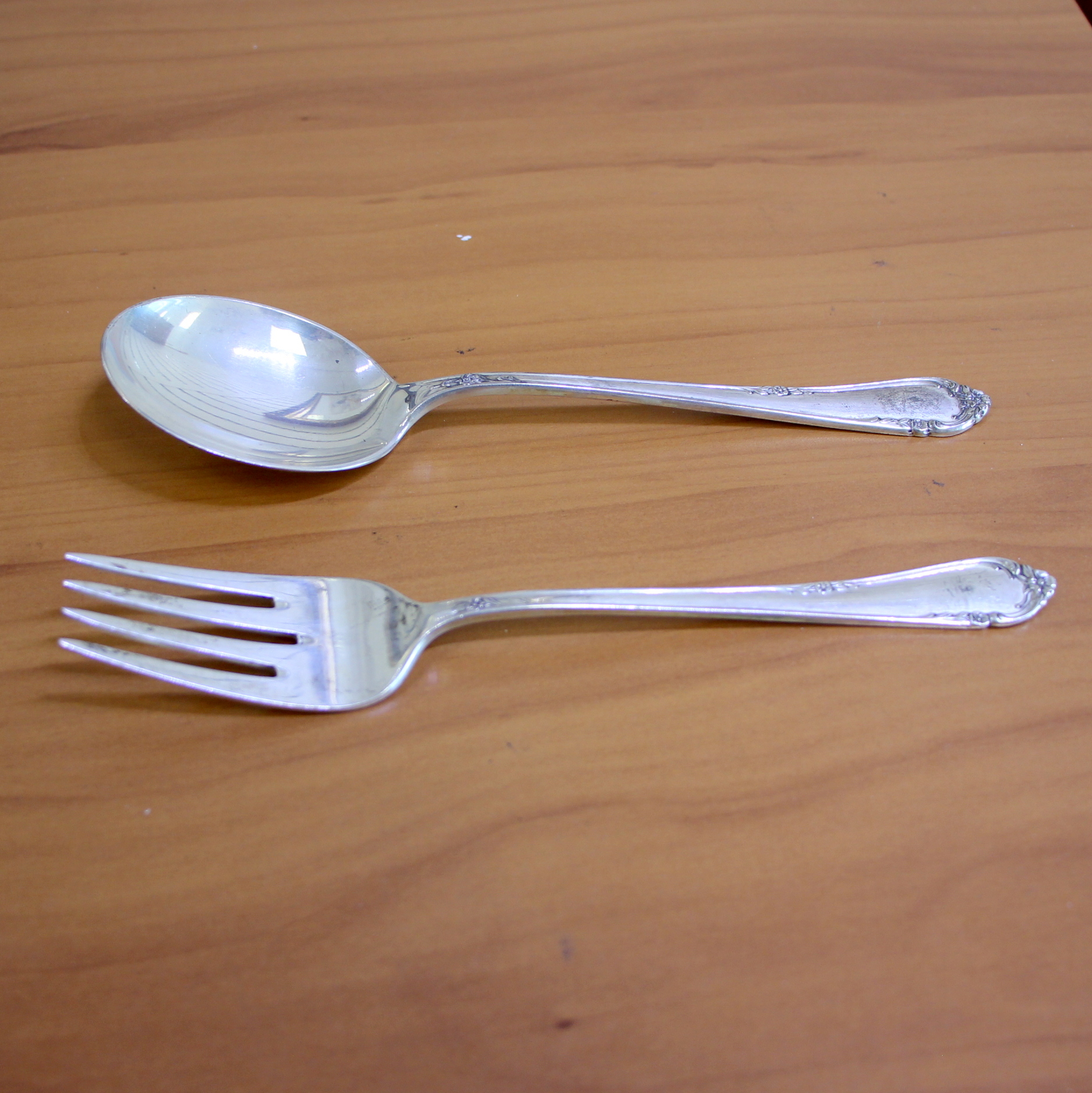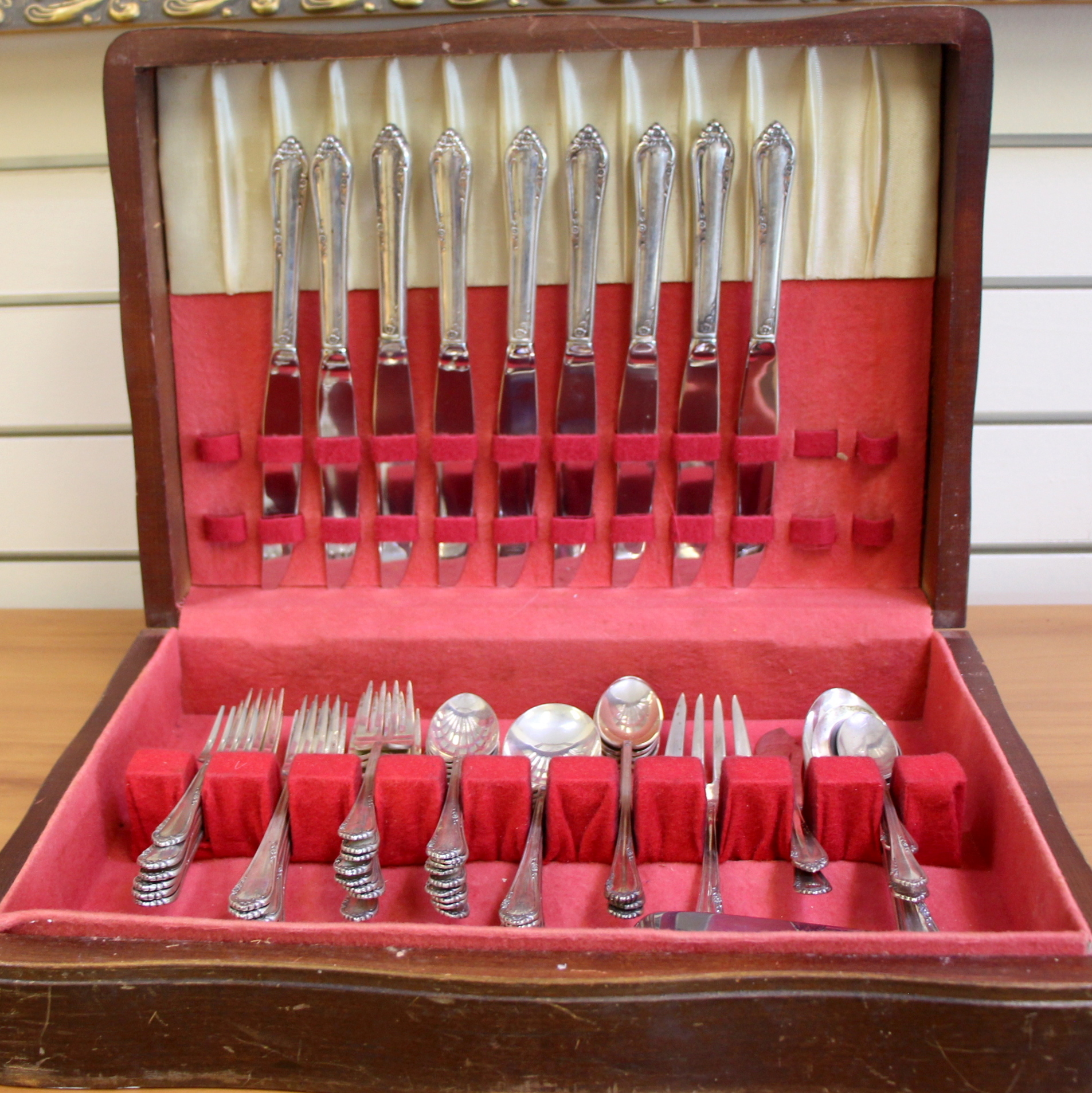 In .925 Sterling Silver. Contains ten forks - 7 1/8", eight salad forks - 6 3/8 inch, nine teaspoons - 6 inch, nine modern knife - 8 3/4 inch, five round bowl cream soup spoons - 6 3/8 inch, four iced tea spoons - 7 1/2" inch, two tablespoon serving spoons -8 5/8 inch, one solid cold meat serving fork - 8 inch, one flat handle butter spreader - 5 3/4 inch, one sugar spoon - 6 1/8 inch, one infant feeding spoon - 6 inch, one baby spoon - 4 5/8 inch, one baby fork - 4 3/8 inch, one pie server - 10 inch. Tarnish resistant wooden storage box. 2,305.8g.