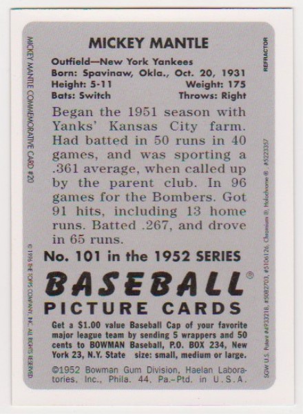 Refractor - 1996 Topps MICKEY MANTLE 1952 Bowman #20 Commemorative Insert Card