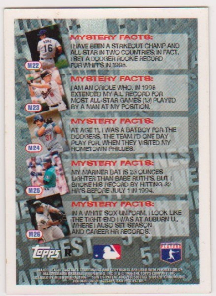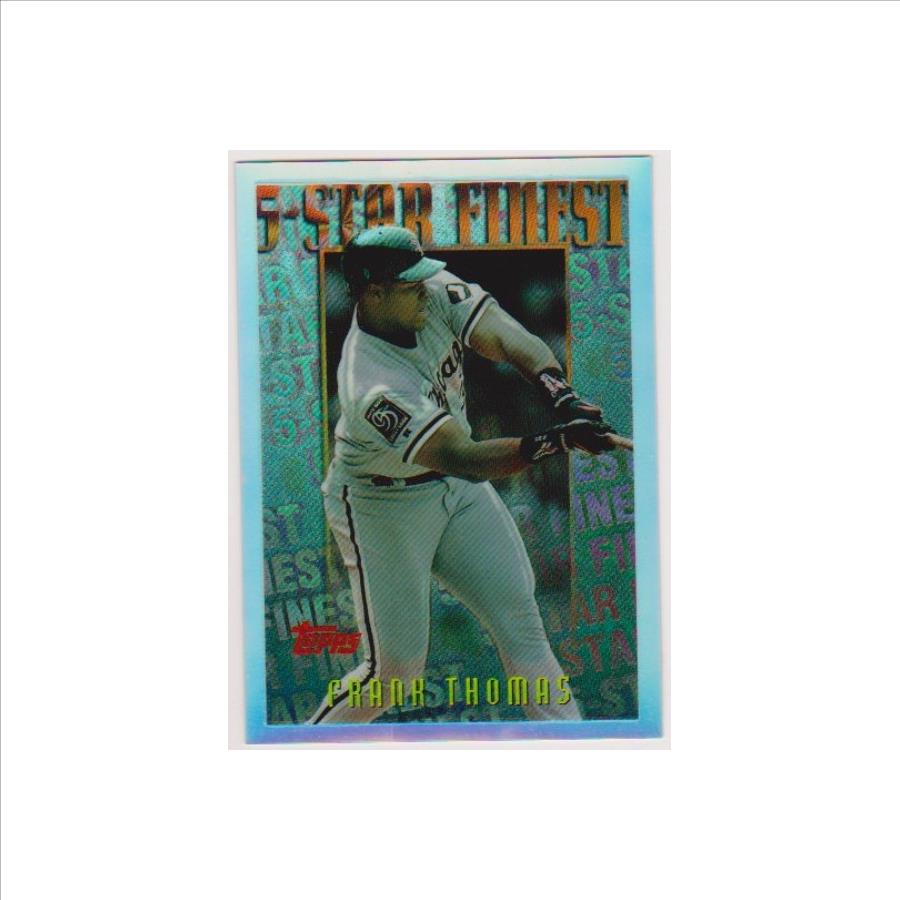 This is a 1996 Topps Finest Mystery Refractor Frank Thomas #M26 insert card.  This one is in approximately EX condition. It has minor surface wear and is a little off center, but overall displays nicely. These Mystery Refractor inserts were very tough to pull from packs.