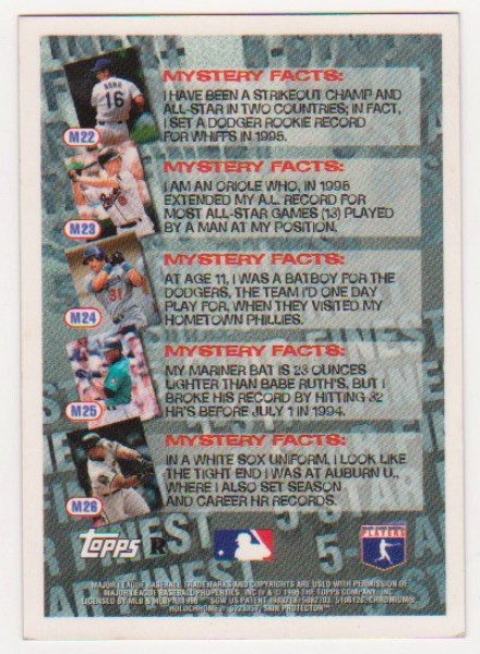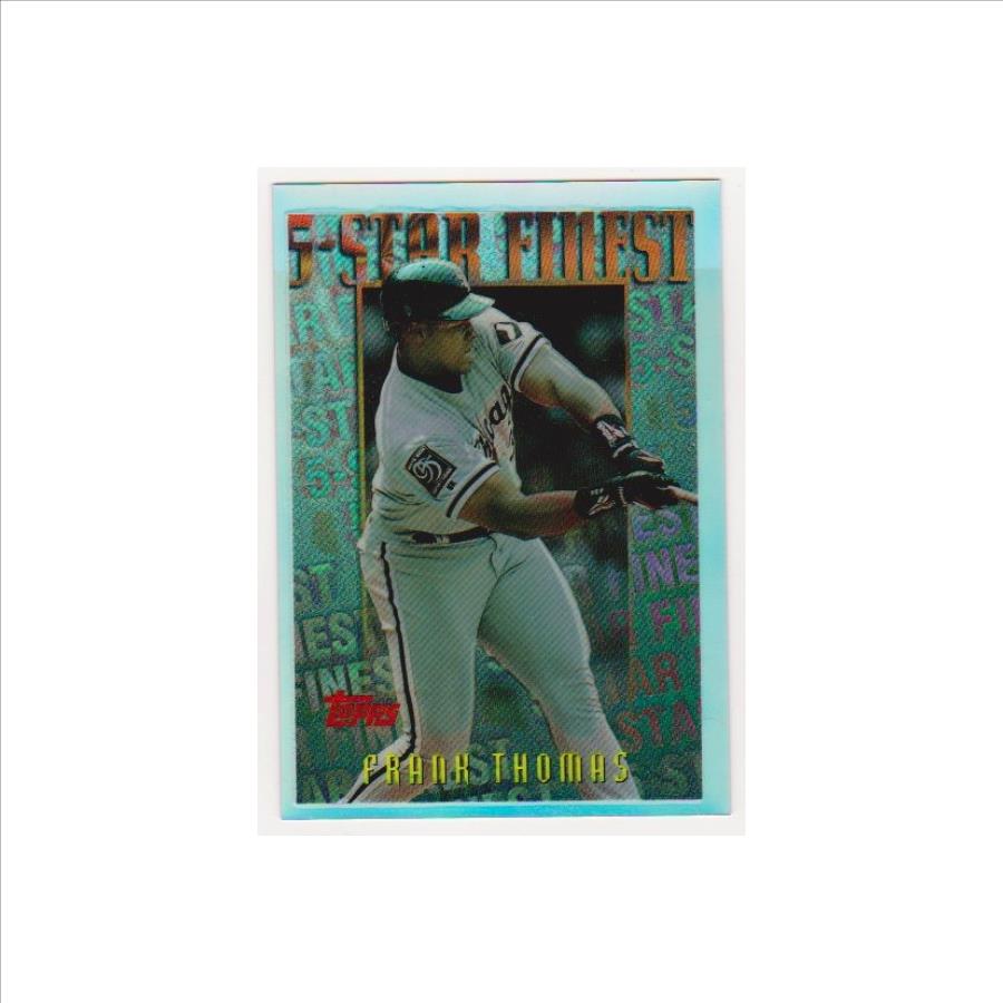 This is a 1996 Topps Finest Mystery Refractor Frank Thomas #M26 insert card.  This one is in approximately EX condition. It has minor surface wear and is off center, but overall displays pretty well. These Mystery Refractor inserts were very tough to pull from packs.