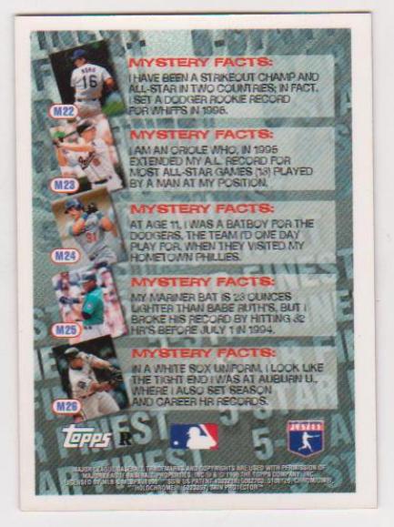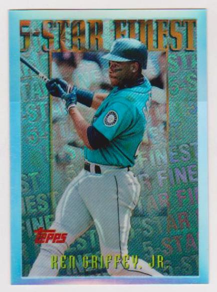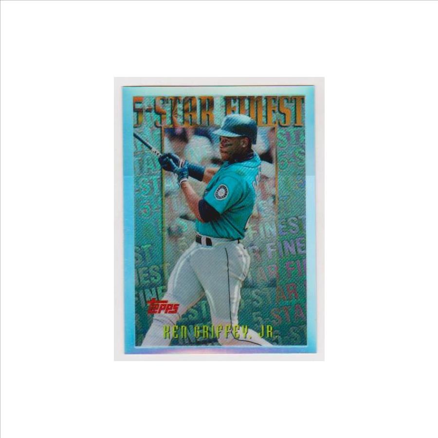 1996 Topps Finest Mystery Refractor Ken Griffey Jr. #M25 insert card.  This one is in approximately EX-MT condition.  It has minor wear and has the typical refractor lines, but overall displays pretty well.  These Mystery Refractor inserts were very tough to pull from packs.