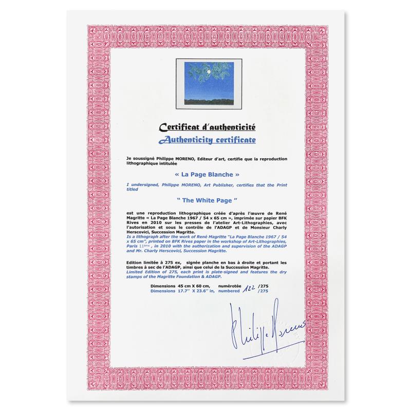 "La Page Blanche (The White Page)" is a limited edition lithograph by Rene Magritte (1898-1967). This piece is numbered 122/275 and bears the dry stamps of the Magritte Foundation & ADAGP (Society of Authors in the Graphic and Plastic Arts) and is signed by the President of the Magritte Foundation, Charly Herscovici. This piece comes custom framed. Includes Certificate of Authenticity. Measures approx. 29.5" x 24" (frame), 23.5" x 18" (image).