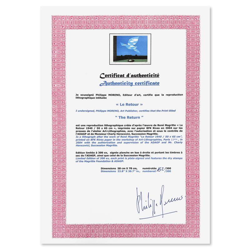 "Le Retour (The Return)" is a limited edition lithograph by Rene Magritte (1898-1967). This piece is numbered 152/300 and bears the dry stamps of the Magritte Foundation & ADAGP (Society of Authors in the Graphic and Plastic Arts) and is signed by the President of the Magritte Foundation, Charly Herscovici. This piece comes custom framed. Includes Certificate of Authenticity. Measures approx. 36.5" x 29" (frame), 30.5" x 23" (image).