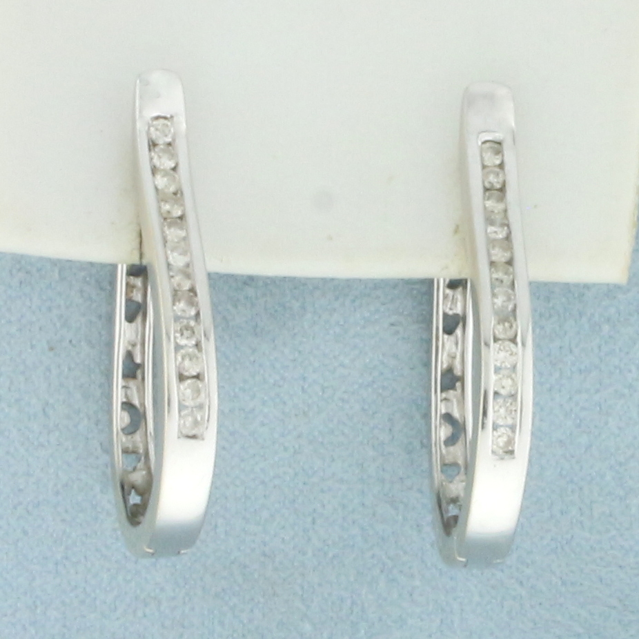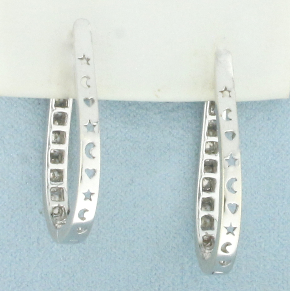 In 14k white gold. Contains 24 high quality diamonds, 1/2ct TW, SI clarity/I color. 1 1/8 inches long x 3/4 inches wide. Star, heart, moon design on other side of earrings, can be worn showing either side. Hinged locking hoop closure. 6.6g.