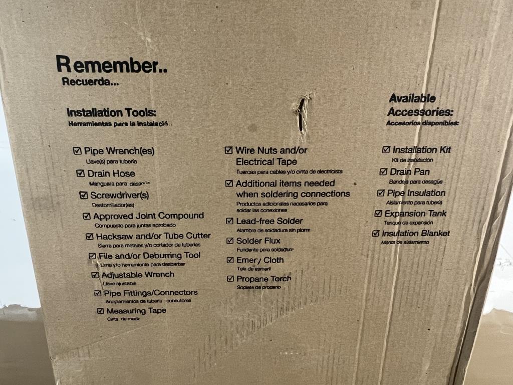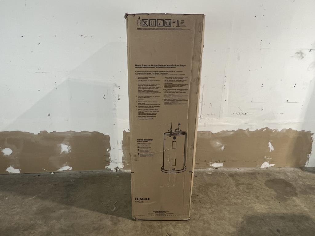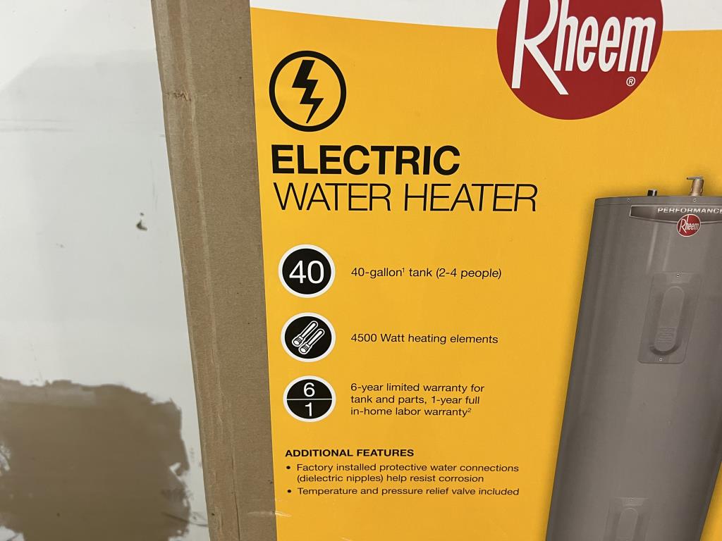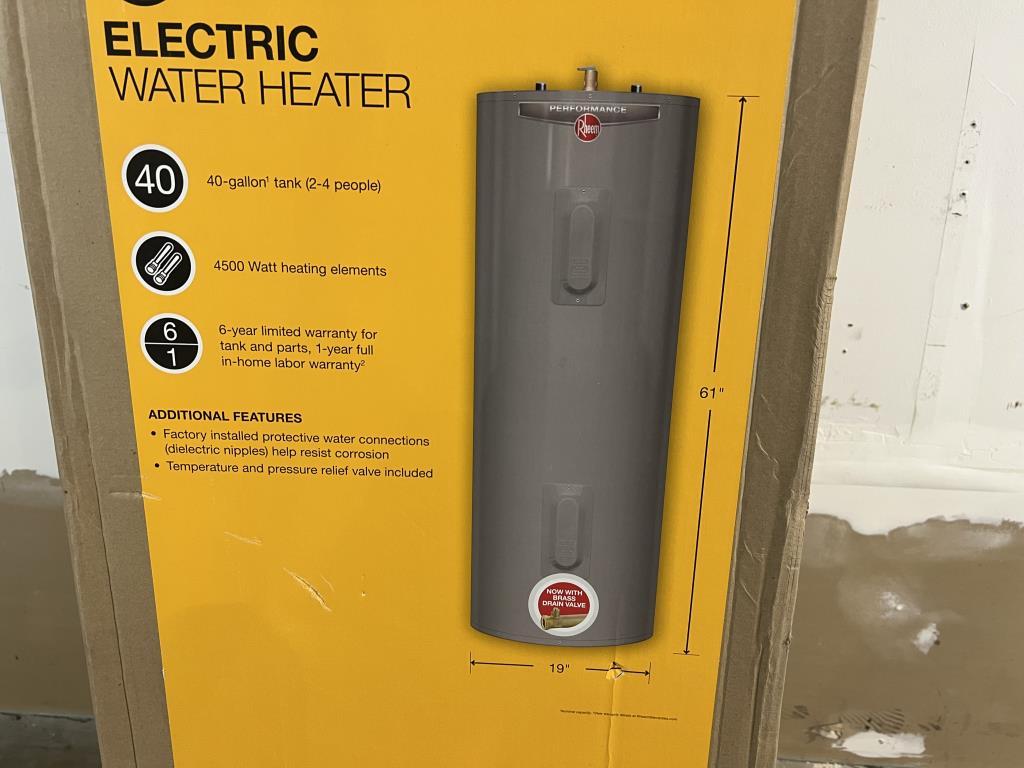 - Item info: electric, 40 gallon, 4500 watts, top water connections, bottom relieve valve, 61" tall x 19" wide