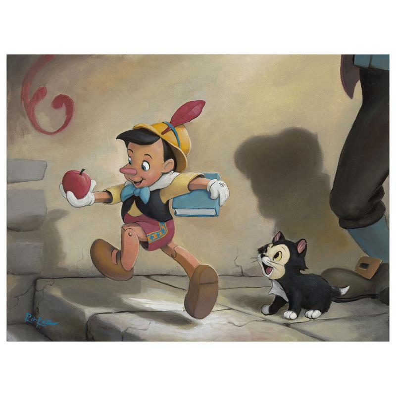 "Off to School" is a limited edition giclee on canvas by Rob Kaz. Part of the Treasures on Canvas collection from Disney Fine Art, thie piece comes gallery wrapped and with certificate of authenticity. Measures approximately 12" x 16".