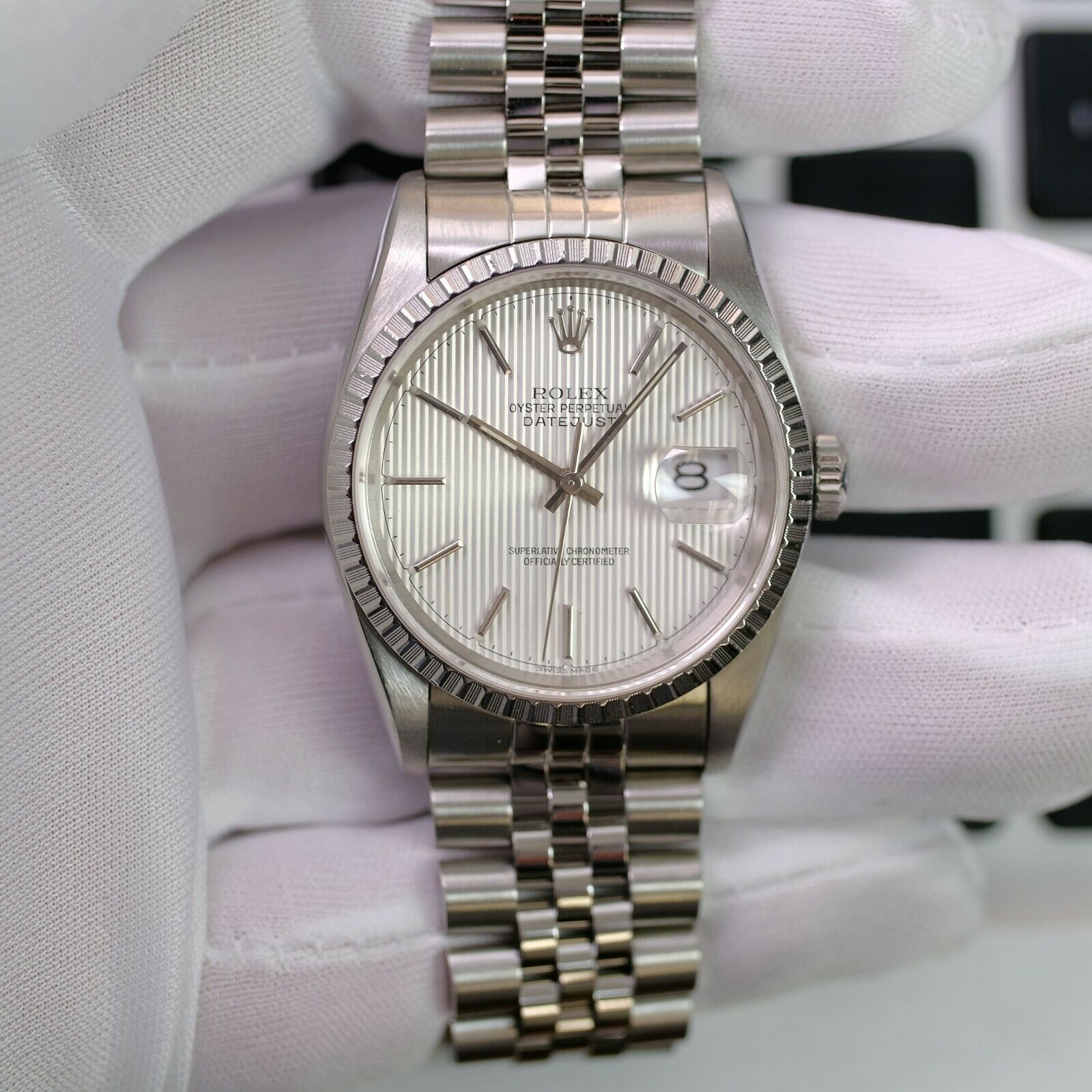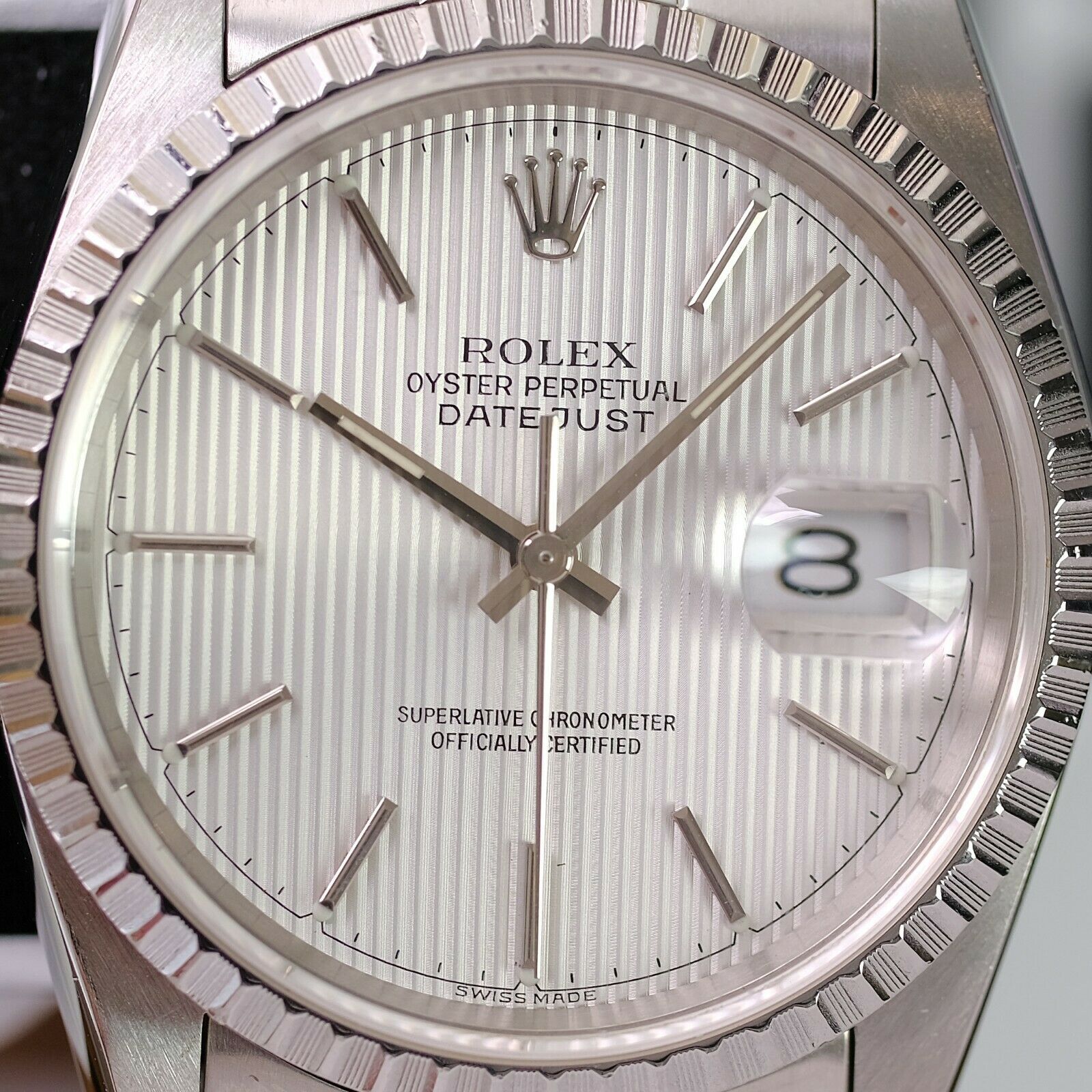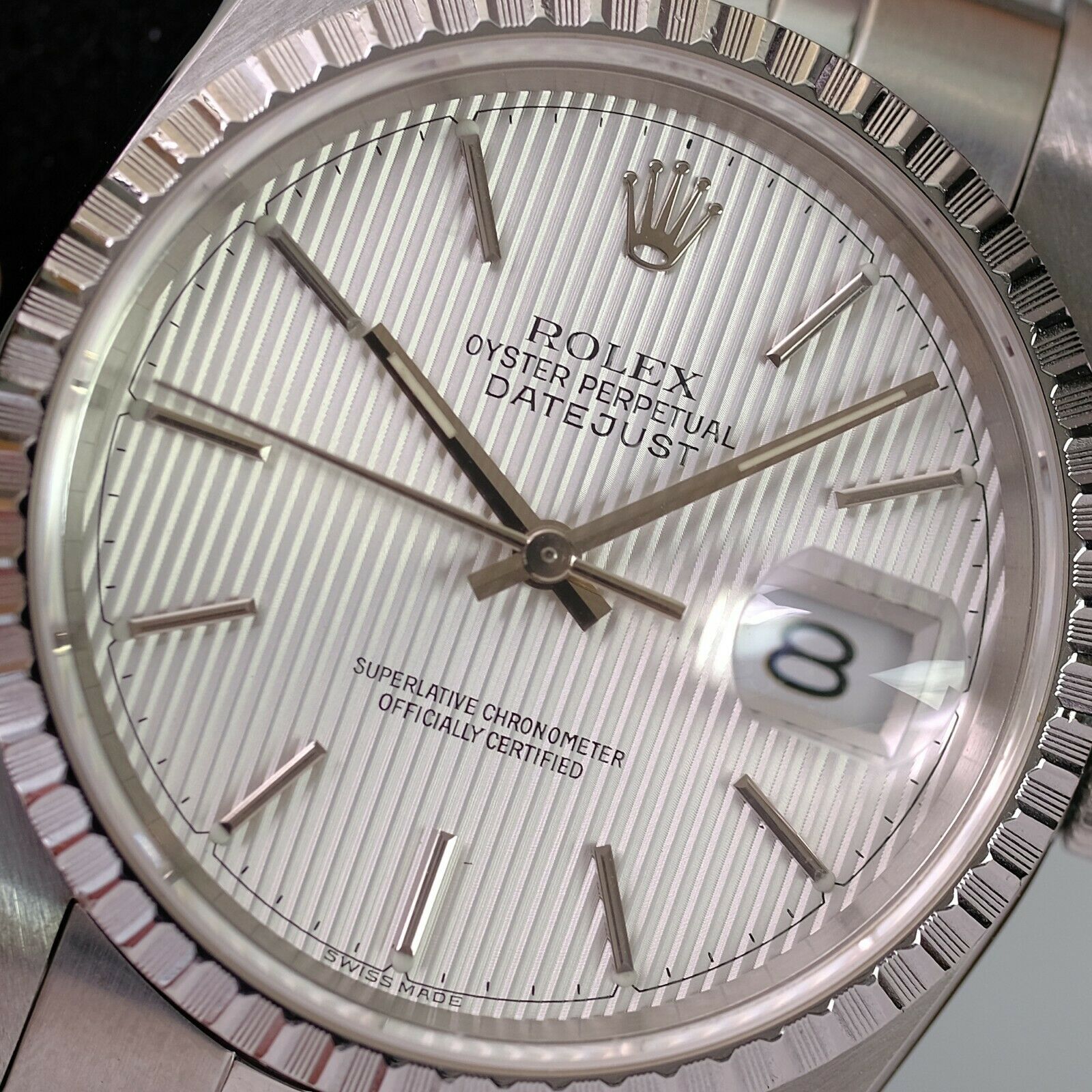 Rolex Mens Datejust SS 36mm Silver Tapestry Dial Engine Turned Bezel Ref16220