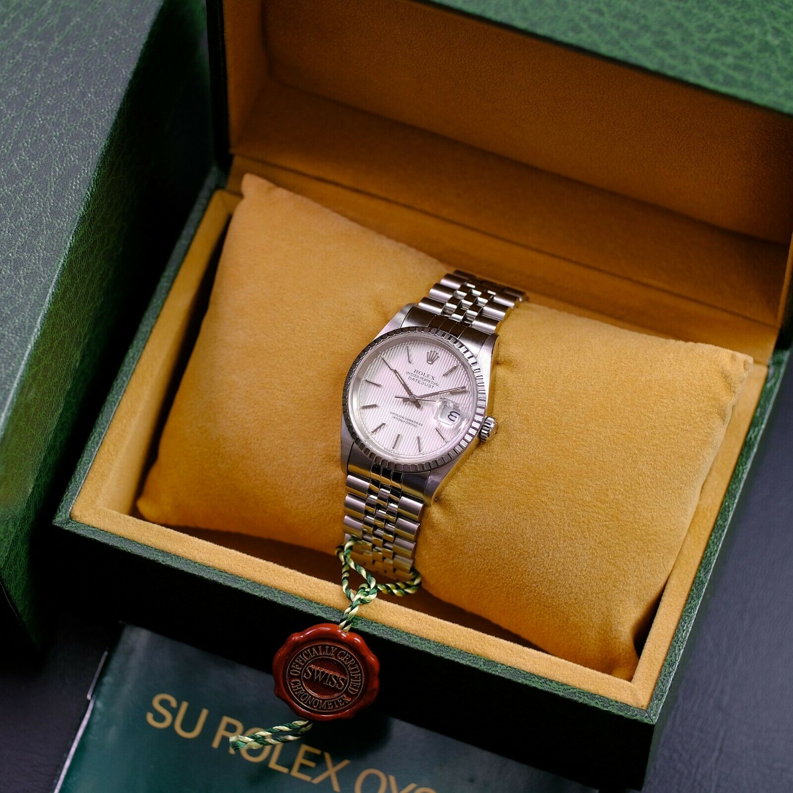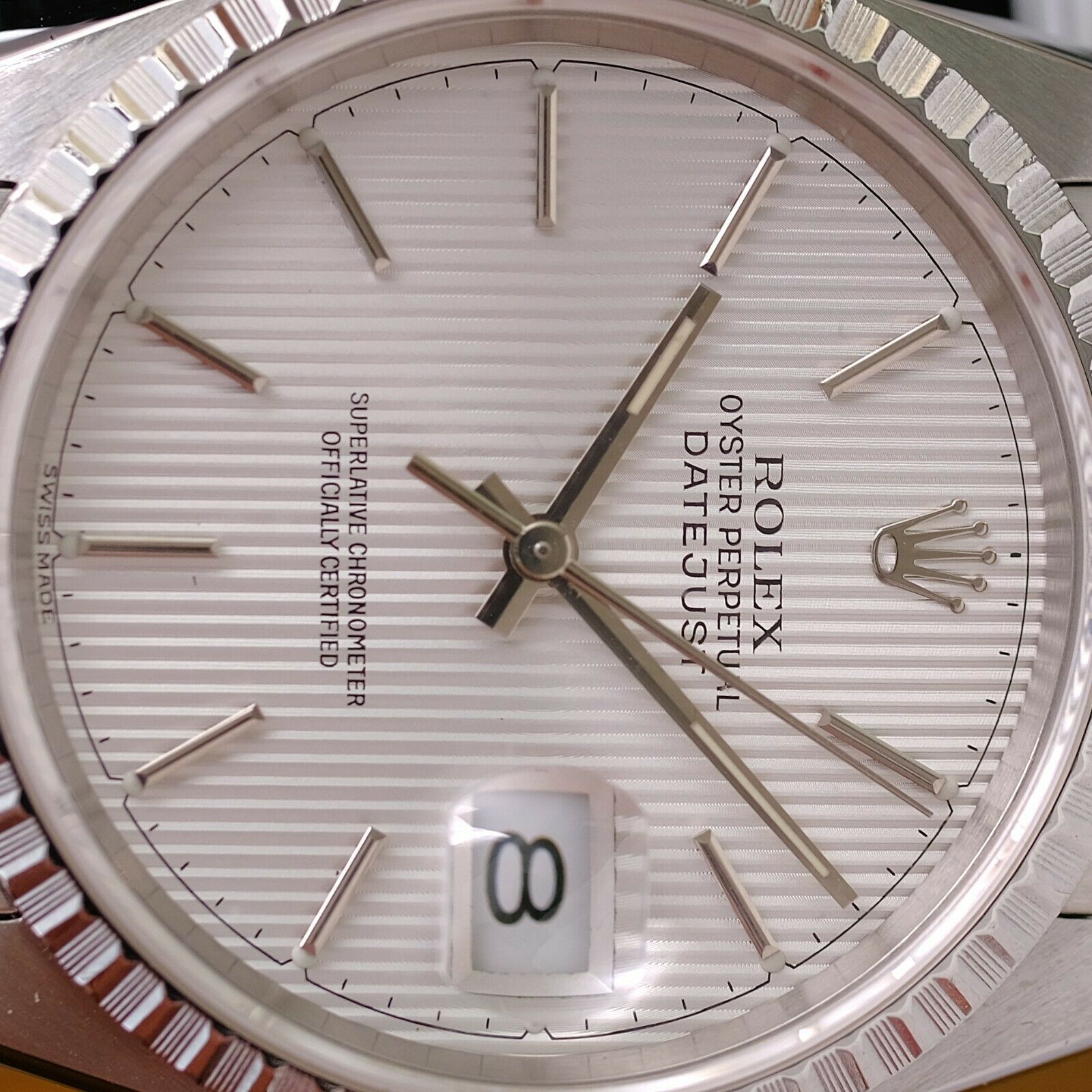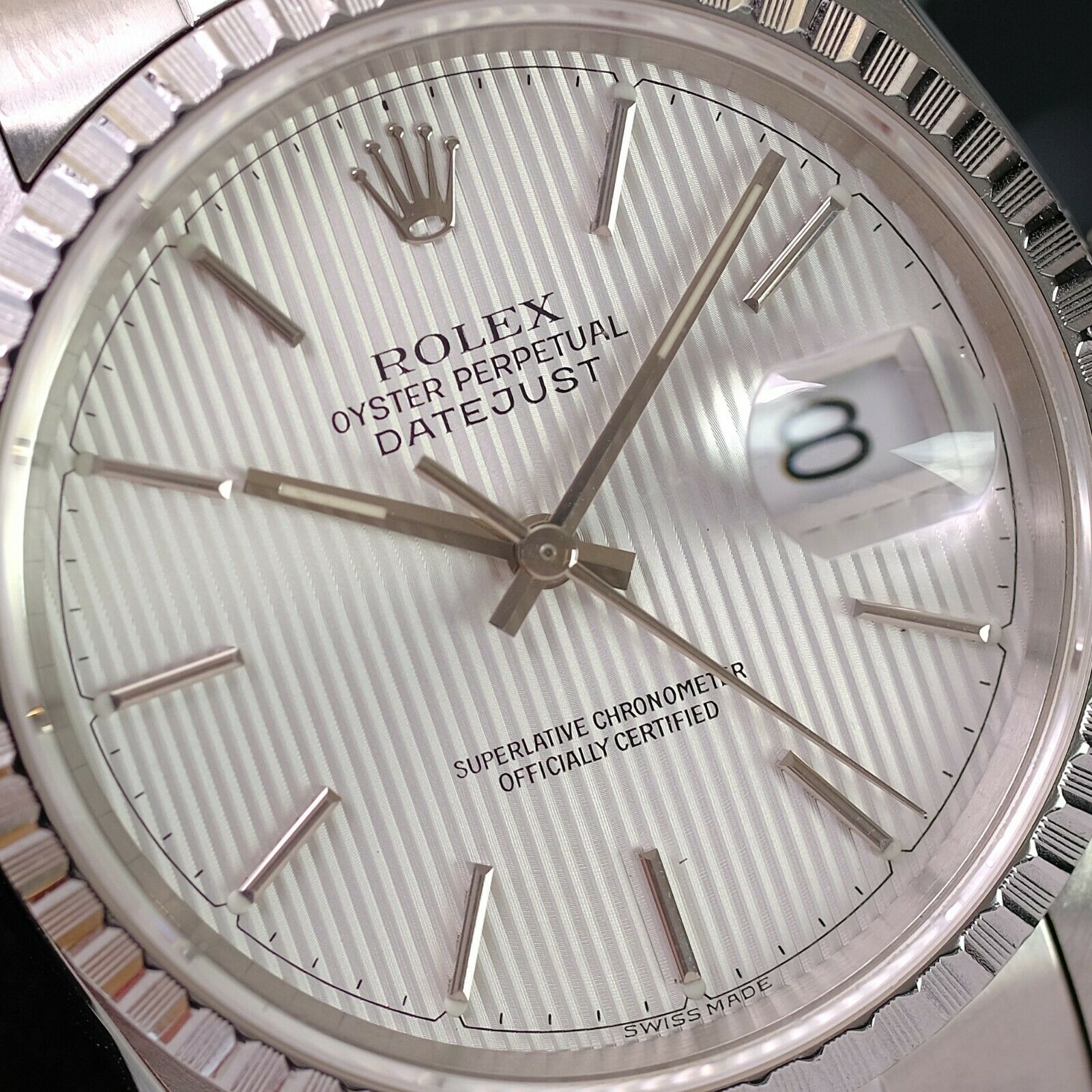 Rolex Mens Datejust SS 36mm Silver Tapestry Dial Engine Turned Bezel Ref16220