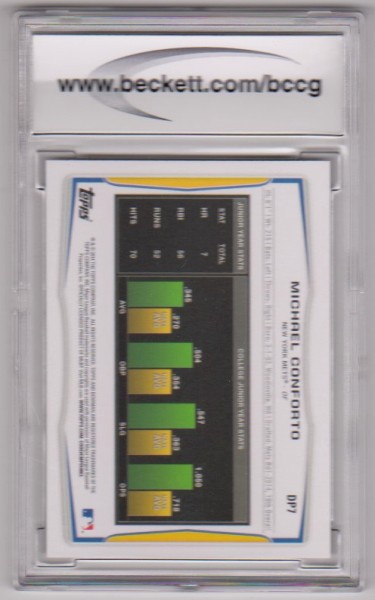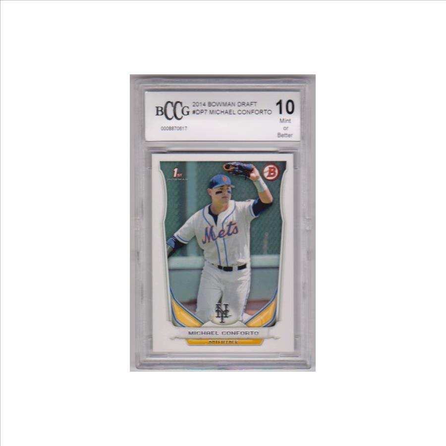 This is a Michael Conforto 2014 Bowman Draft #DP7 rookie card that has been graded a Mint or Better 10 by BCCG.  The holder has minor surface wear, but overall this is a nice high grade Conforto rookie.