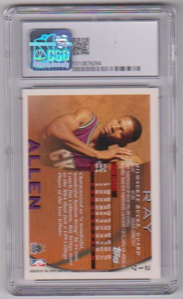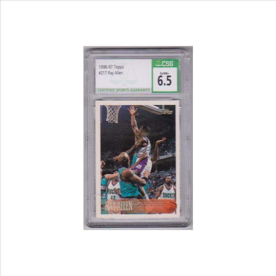 This is a 1996-97 Topps Ray Allen #217 rookie card that has been graded an EX/NM+ 6.5 by CSG.  The holder has some light surface wear, but overall this is a nice graded rookie card of this NBA Hall of Famer.