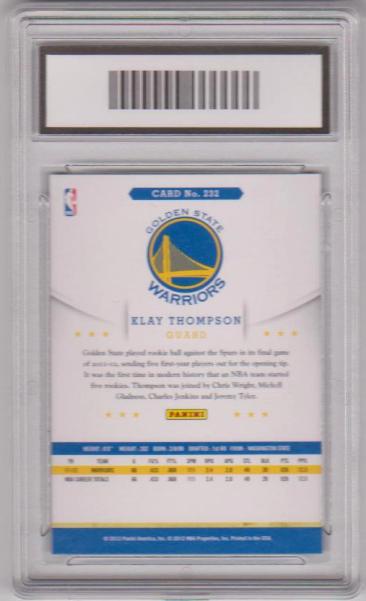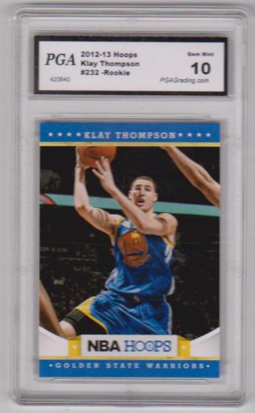 This is a Klay Thompson 2012-13 Hoops #232 rookie card that has been graded a Gem Mint 10 by PGA.  The holder has some surface wear/scuffs, but overall this is a nice graded rookie card of this 5-Time NBA All-Star.