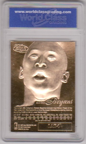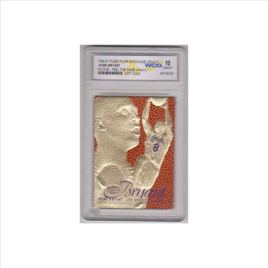 This is a 1996-97 Fleer Flair Showcase Legacy Feel The Game (Away) 23 Kt Gold Kobe Bryant rookie card that has been graded a Gem Mint 10 by WCG.  The holder has a couple small light surface scuffs on the front, but overall this is a sharp graded rookie card of this NBA Hall of Famer.